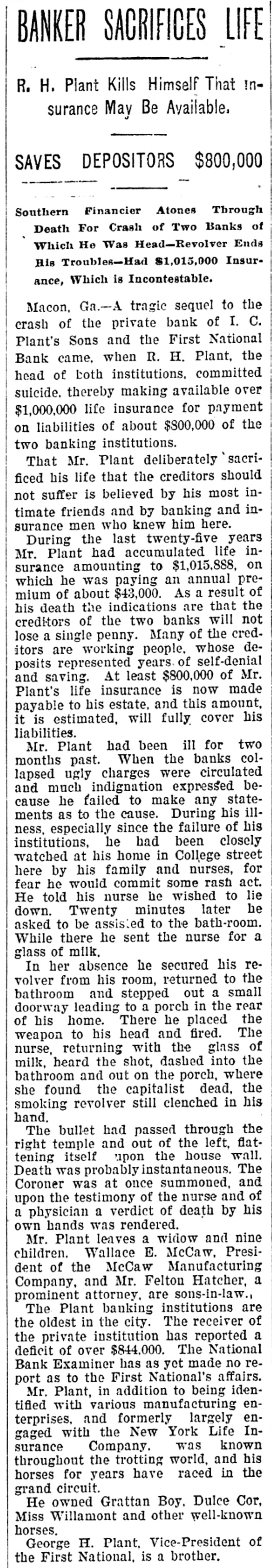 BANKER SACRIFICES LIFE R. H. Plant Kills Himself That Insurance May Be Available. SAVES DEPOSITORS $800,000 Southern Financier Atones Through Death For Crash of Two Banks of Which He Was Head-Revolver Ends His Troubles-Had $1,015,000 Insurance, Which is Incontestable. Macon. Ga.-A tragic sequel to the crash of the private bank of I. C. Plant's Sons and the First National Bank came, when R. H. Plant, the head of both institutions. committed suicide. thereby making available over $1,000,000 life insurance for payment on liabilities of about $800,000 of the two banking institutions. That Mr. Plant deliberately sacrificed his life that the creditors should not suffer is believed by his most intimate friends and by banking and insurance men who knew him here. During the last twenty-five years Mr. Plant had accumulated life insurance amounting to $1,015,888, on which he was paying an annual premium of about $43,000. As a result of his death the indications are that the creditors of the two banks will not lose a single penny. Many of the creditors are working people. whose deposits represented years of self-denial and saving. At least $800,000 of Mr. Plant's life insurance is now made payable to his estate. and this amount, it is estimated, will fully cover his liabilities. Mr. Plant had been ill for two months past. When the banks collapsed ugly charges were circulated and much indignation expressed because he failed to make any statements as to the cause. During his illness, especially since the failure of his institutions, he had been closely watched at his home in College street here by his family and nurses, for fear he would commit some rash act. He told his nurse he wished to lie down. Twenty minutes later he asked to be assisted to the bath-room. While there he sent the nurse for a glass of milk. In her absence he secured his revolver from his room, returned to the bathroom and stepped out a small doorway leading to a porch in the rear of his home. There he placed the weapon to his head and fired. The nurse, returning with the glass of milk, heard the shot, dashed into the bathroom and out on the porch, where she found the capitalist dead, the smoking revolver still clenched in his hand. The bullet had passed through the right temple and out of the left, flattening itself upon the house wall. Death was probably instantaneous. The Coroner was at once summoned, and upon the testimony of the nurse and of a physician a verdict of death by his own hands was rendered. Mr. Plant leaves a widow and nine children. Wallace E. McCaw, President of the McCaw Manufacturing Company, and Mr. Felton Hatcher, a prominent attorney. are sons-in-law., The Plant banking institutions are the oldest in the city. The receiver of the private institution has reported a deficit of over $844,000. The National Bank Examiner has as yet made no report as to the First National's affairs. Mr. Plant, in addition to being identifled with various manufacturing enterprises, and formerly largely engaged with the New York Life Insurance Company. was known throughout the trotting world, and his horses for years have raced in the grand circuit. He owned Grattan Boy. Dulce Cor, Miss Willamont and other well-known horses. George H. Plant, Vice-President of the First National, is a brother.