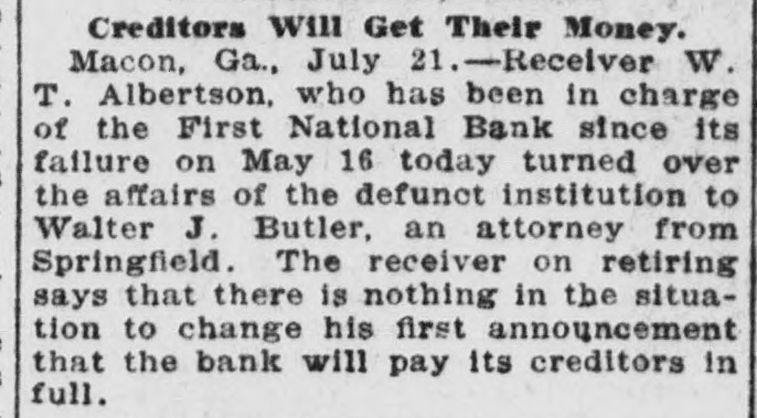Creditors Will Get Their Money. Macon, Ga., July 21.-Receiver W. T. Albertson, who has been in charge of the First National Bank since its failure on May 16 today turned over the affairs of the defunct institution to Walter J. Butler, an attorney from Springfield. The receiver on retiring says that there is nothing in the situation to change his first announcement that the bank will pay its creditors in full.