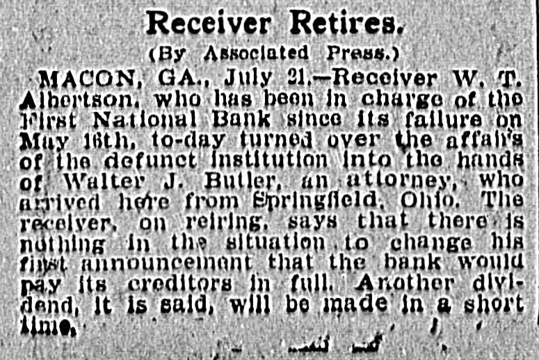 Receiver Retires. (By Associated Press.) MACON, GA., July 21.-Receiver W. T. Albertson. who has been in charge of the first National Bank since its failure on May 16th. to-day turned over the affair's of the defunct institution into the hands of Walter J. Butler, an attorney, who arrived here from Springfield, Ohio. The receiver, on reiring, says that there is nothing in the situation to change his first announcement that the bank would pay its creditors in full. Another dlvidend, It is said, will be made in a short time,