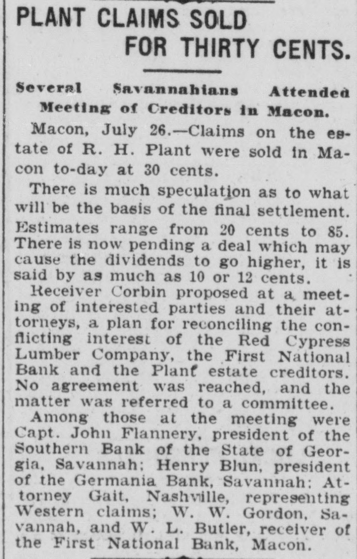 PLANT CLAIMS SOLD FOR THIRTY CENTS. Several Savannahians Attended Meeting of Creditors in Macon. Macon, July 26.-Claims on the estate of R. H. Plant were sold in Macon to-day at 30 cents. There is much speculation as to what will be the basis of the final settlement. Estimates range from 20 cents to 85. There is now pending a deal which may cause the dividends to go higher, it is said by as much as 10 or 12 cents. Receiver Corbin proposed at a, meeting of interested parties and their attorneys, a plan for reconciling the conflicting interest of the Red Cypress Lumber Company, the First National Bank and the Plant estate creditors. No agreement was reached, and the matter was referred to a committee. Among those at the meeting were Capt. John Flannery, president of the Southern Bank of the State of Georgia, Savannah: Henry Blun, president of the Germania Bank, Savannah: Attorney Gait, Nashville, representing Western claims; W. W. Gordon, Savannah, and W. L. Butler, receiver of the First National Bank, Macon.