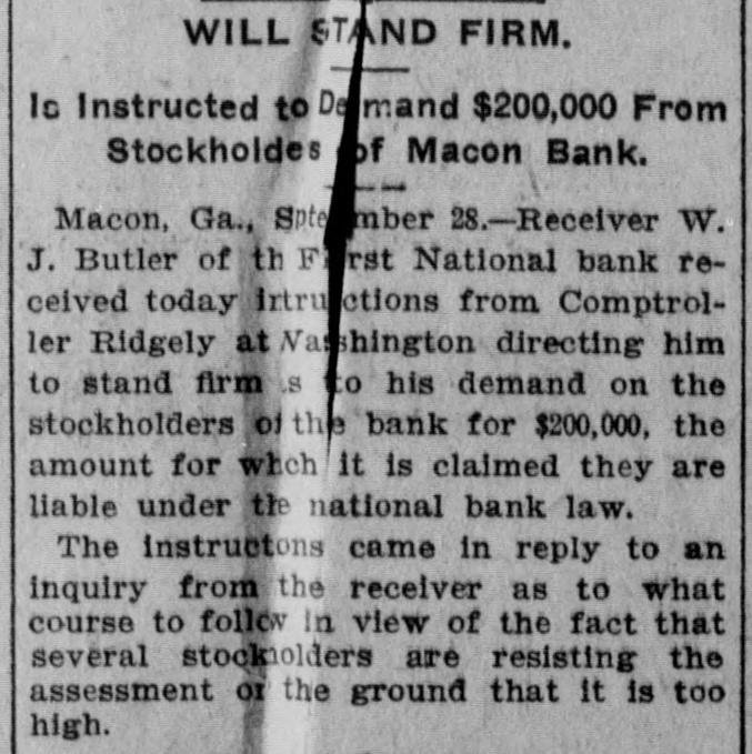 Ordered to Stand Firm. A few days ago Receiver W. J. Butler, of the First National Bank at Macon, received instructions from Comptroller Ridgely, at Washington, directing him to stand firm as to his demand on the stockholders of the bank for $200,000, the amount for which it is claimed they are liable under the national bank law. The instructions came in reply to an inquiry from the receiver as to what course to follow, in view of the fact that several stockholders are regsisting the assessment, on the ground that it is too high.