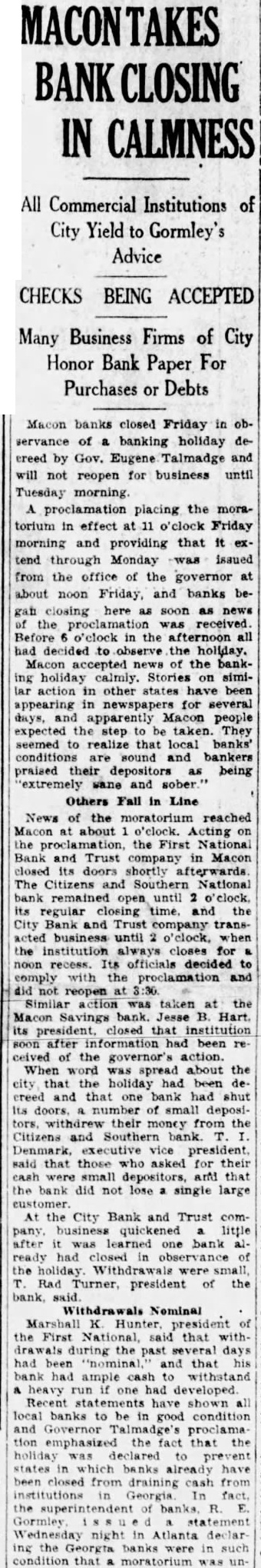 IN CALMNESS All Commercial Institutions of City Yield to Gormley's Advice CHECKS BEING ACCEPTED Many Business Firms of City Honor Bank Paper For Purchases or Debts Macon banks closed Friday in observance of banking holiday decreed by Gov. Eugene Talmadge and will not reopen for business until Tuesday morning proclamation placing the moratorium in effect o'clock Friday morning and providing that it extend through Monday issued from the office of the governor at about noon Friday, and banks began closing here soon as news the proclamation was received. Before o'clock the afternoon all had decided to observe the holiday. accepted the banking calmly. Stories on simiaction in other have been appearing in newspapers for several days, apparently Macon people expected the taken They seemed realize that local banks' conditions sound and bankers praised their depositors being extremely wane and sober.' Others in Line News of the moratorium reached Macon about o'clock. Acting on the proclamation, the First National Bank and Trust company in Macon closed its doors shortly afterwards The Citizens Southern National open until o'clock, its regular and the City Bank Trust company until 2 o'clock, when the institution for noon recess. Its officials decided to comply with the proclamation and did not reopen Similar action was taken at the Macon Savings bank. Jesse B. Hart. its president, closed that institution after information had been re of the action. was spread about the city that holiday had been creed and that bank had shut Its number of withdrew their money from the Citizens and Southern bank. Denmark, executive vice president said that those for their cash were small depositors, that the did not single large the City Bank and Trust little learned one bank already had closed of the small, Rad president of the bank, Withdrawals Nominal Marshall president of the First National, said that withpast days had and that his had withstand heavy one had developed statements have shown all banks to in good condition and Governor Talmadge's emphasized the fact that the holiday prevent states already have closed from draining from fact superintendent R. Gormley night in Atlanta ing the Georgia banks in such condition that moratorium
