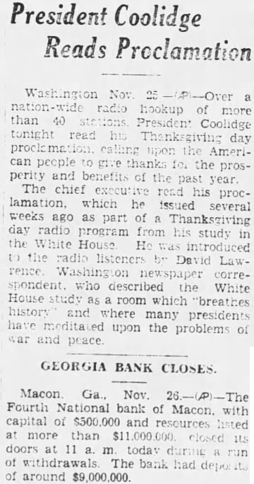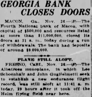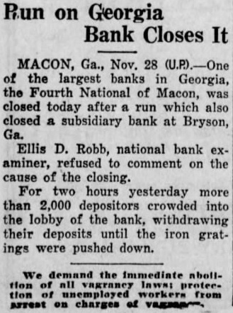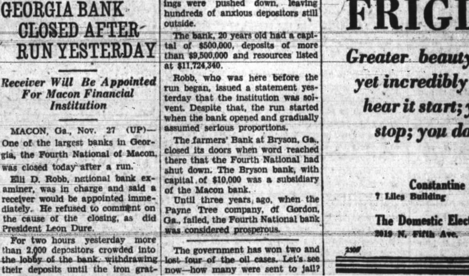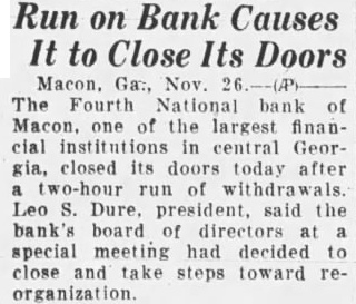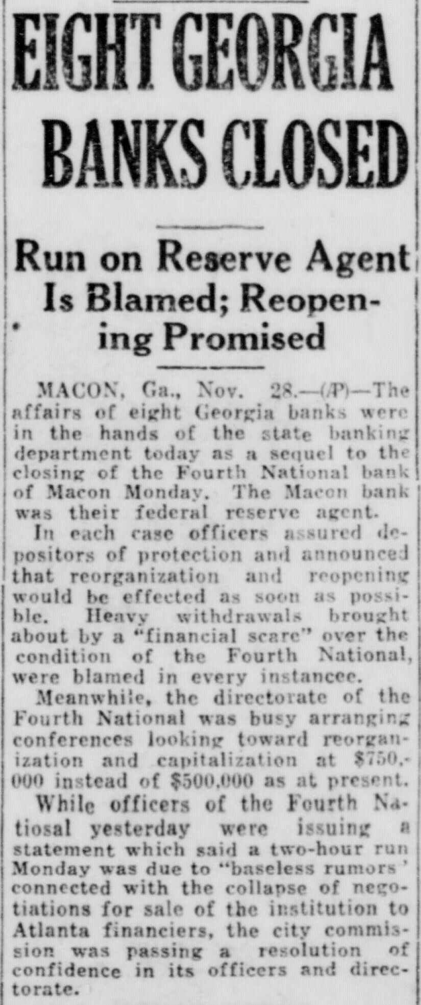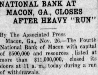 Macon, Nov. 26. (AP) The Fourth National bank of Macon, with capital of $500,000 and resources listed at more than $11,000,000, closed its doors at 11 a. m., today during a run of withdrawals. The bank had deposits of around $9,000,000.