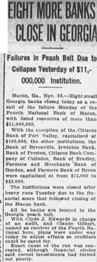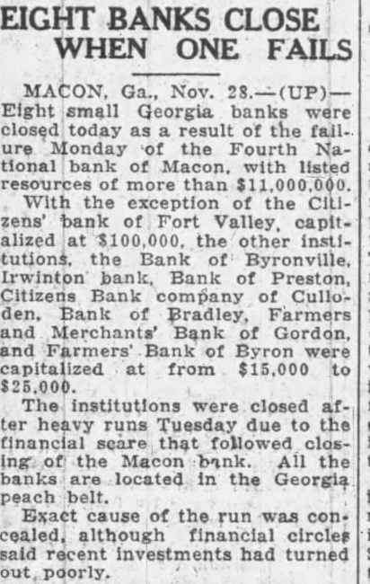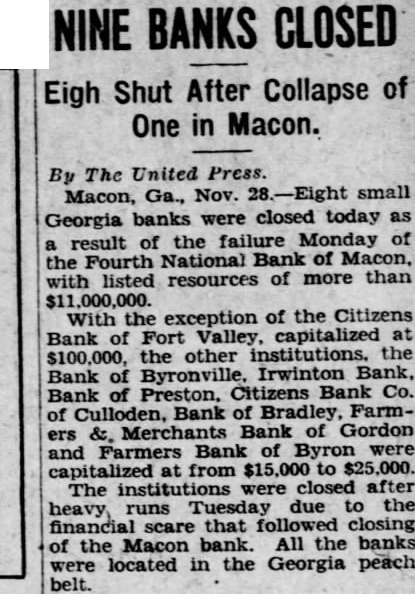 By The United Press. Macon, Ga., Nov. 28.-Eight small Georgia banks were closed today as result of the failure Monday of the Fourth National Bank of Macon, with listed resources of more than $11,000,000. With the exception of the Citizens Bank of Fort Valley, capitalized at $100,000, the other institutions. the Bank of Byronville Irwinton Bank, Bank Preston. Citizens Bank Co. of Culloden, Bank Bradley, Farmers &, Merchants Bank of Gordon and Farmers Bank of were capitalized at from $15,000 to $25,000. The institutions were closed after heavy runs Tuesday due to the financial scare that followed closing of the Macon bank. All the banks were located in the Georgia peach belt.