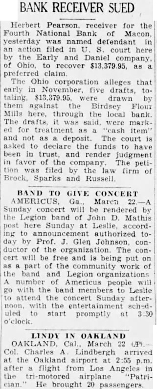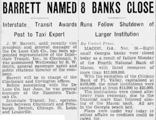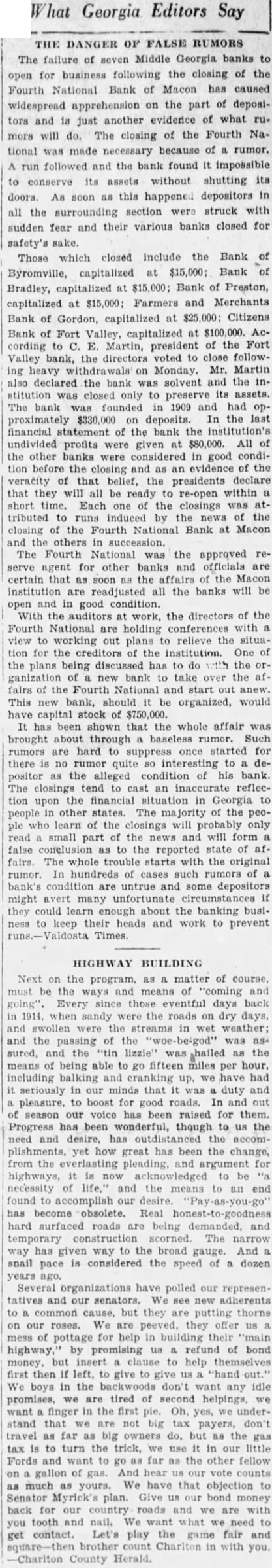 DANGER OF FALSE The failure of Middle Georgia open business following closing of the Fourth National Bank of Macon has caused widespread apprehension the part of depositors and just another of what will closing of the Fourth Namors do. tional necessary because of rumor. followed the bank found impossible to assets without shutting its doors. As soon this happened depositors all the surrounding section struck with sudden fear and their various banks closed for safety's Those which closed include the Bank Byromville, capitalized $15,000; Bank Bradley, capitalized $15,000; Bank Preston, capitalized at $15,000; Farmers Merchants Bank of Gordon, capitalized at Citizens Bank Fort Acthe Fort cording Valley the voted Monday. Mr. Martin ing the bank solvent and the was only The bank had the last financial the bank the profits All the other good condition closing and of the presidents declare that they will all re-open within short closings was tributed by the news the closing the Fourth Bank at Macon succession. National the approved agent for other banks and officials are certain the affairs the Macon readjusted all the banks will open good With work, the directors of the National are holding working out plans relieve situation for the the plans being has the ganization bank take over the Fourth National and start This new bank, should organized, would capital stock $750,000. has been shown that the whole affair was brought about through baseless rumor. Such rumors hard suppress once started for there rumor quite interesting positor alleged his bank. The closings reflection upon the financial situation Georgia people other the learn the closings small the will form to the reported state whole starts the original rumor. cases such rumors of some depositors might they about the banking their heads and work to prevent Times