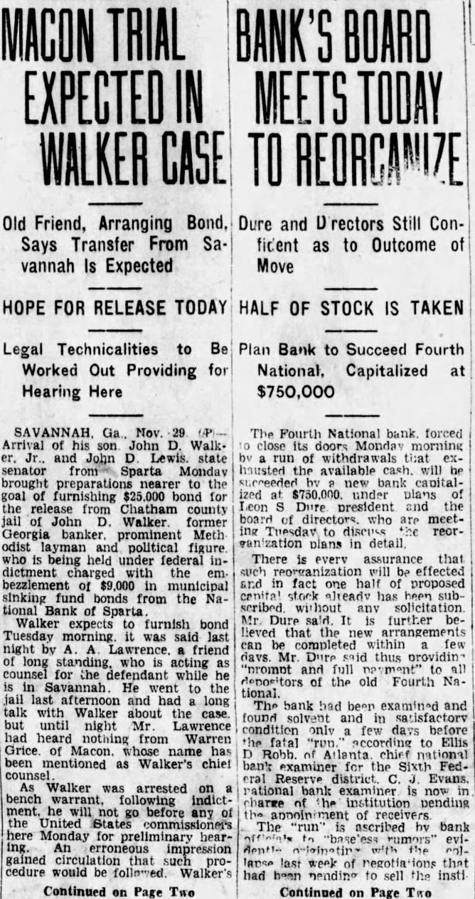Arrival his son John Walkand John Lewis. state senator Sparta Monday brought nearer to the goal furnishing $25,000 bond for release from Chatham county jail of John D. Walker former Georgia banker. prominent Meth odist layman and political figure. who being held under federal dictment with the em. bezzlement of $9,000 in municipal sinking fund bonds from the National Bank of Sparta Walker expects furnish bond Tuesday morning. was said last night by friend who acting counsel the defendant while he He went to the jail last afternoon and had long talk with Walker about the case. but until night Lawrence had heard nothing from Warren Grice. of Macon. whose name has been mentioned as Walker's chief counsel As Walker was arrested on bench following indictment, he will go before any the United States here Monday for preliminary hearerroneous impression gained that such procedure would be followed. Walker's Continued on Page Two