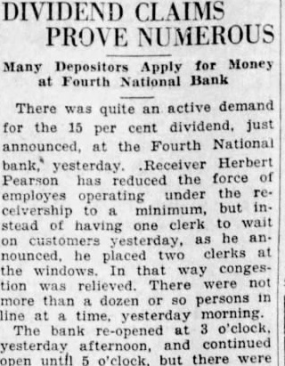 There was quite an active demand for the 15 per cent dividend. just announced, at the Fourth National bank," yesterday Receiver Herbert Pearson has reduced the force of employes operating under the receivership to minimum, but in. stead of having one clerk to wait on customers yesterday, as he announced. he placed two clerks at the windows. In that way congestion was relieved. There were not more than dozen or so persons in line at time. yesterday morning. The bank re-opened at 3 o'clock, yesterday afternoon, and continued open until o'clock, but there were