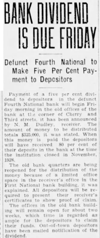 Payment of five per cent divi. dend depositors defunct Fourth will begin in old the of Cherry and Third has been M Dudley The amount to be distributed totals stated When this money paid the depositors will have received 80 cent of their deposits the time the closed in 1928 The old bank quarters are being reopened for the distribution of money limited office the office in the First National bank explained All depositors will be quired to present their receiver's certificates show proof claim. The in the old buildwill for ing which as ample for depositors their funds town have mailed notification of the dividend