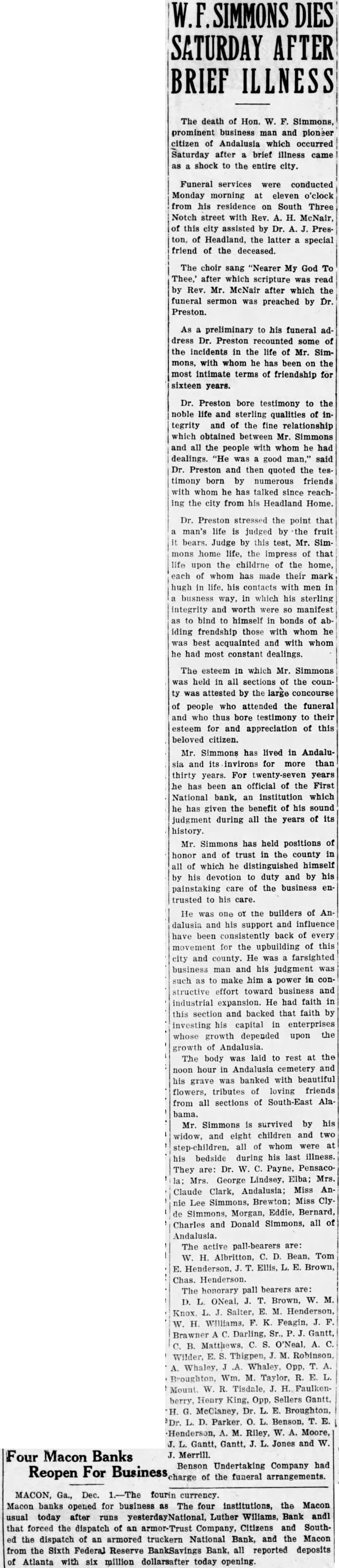 He one the builders of dalusia and his support and influence have been consistently back of for the upbuilding of this movement and county. He farsighted business and his judgment such make him power in effort toward business and industrial expansion. He had section and backed that faith investing capital enterprises whose growth depended upon growth Andalusia. body was laid to rest hour Andalusia cemetery and banked with beautiful grave tributes loving friends flowers, from all sections of South-East survived by his Mr. Simmons and eight children and two widow, all whom step-children, his bedside during his last Payne, PensacoThey Mrs. George Lindsey, Elba; Andalusia; Miss AnClaude Clark, Lee Simmons, Morgan, Eddie, Bernard, Simmons, Charles and Donald Simmons, Andalusia. The Albritton, Tom Henderson. Ellis, Brown, Chas. Henderson. The honorary bearers ONeal, Brown, Knox. Salter, Feagin, Gantt, Matthews, Wilder, Thigpen, Whaley, Opp. Broughton, Wm. Mount. Tisdale, Henry Opp. Sellers Broughton, Benson, Riley, Moore, Gantt, Gantt, Jones and Merrill. Benson Undertaking Company had of the funeral arrangements.