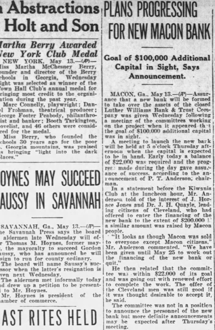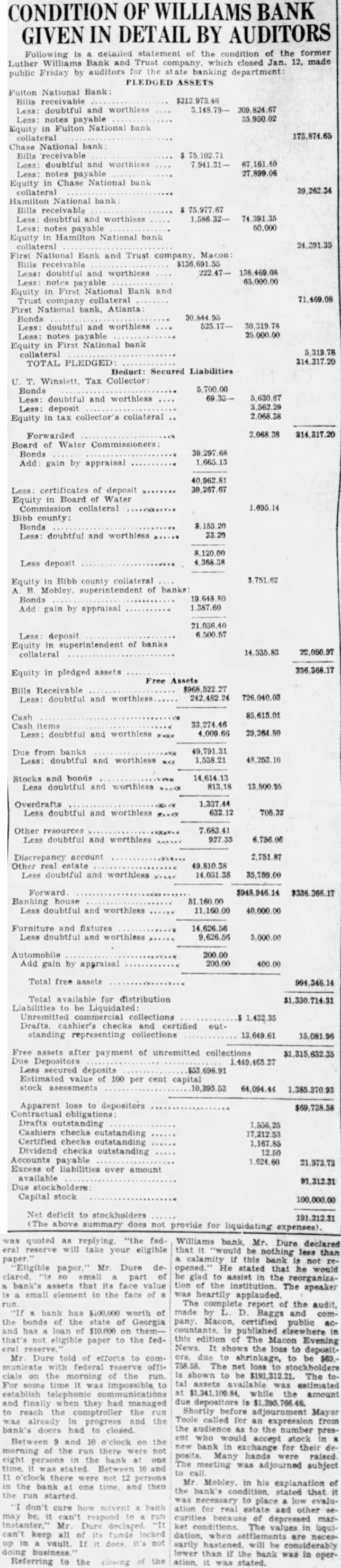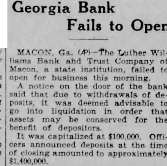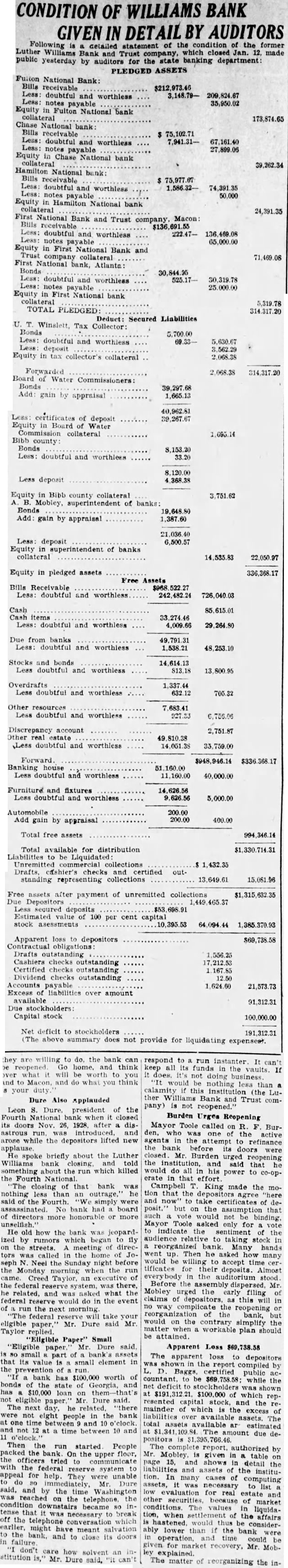 Dure Leon president the Fourth doors 1928, after disand while the lifted He briefly about the Luther Williams bank closing something about run which killed the Fourth that bank nothing Fourth. simply bank had board directors more He old how the bank was jeopardby rumors which began streets. directors called the night the morning the run Taylor, the federal there, and asked what the federal would the event the next federal take eligible Mr. Dure Mr. Taylor replied. "Eligible Small "Eligible of assets its value element in the bank $100,000 worth of bonds the state Georgia, $10,000 loan eligible said. not bank time 10 and Then the started People packed the the floor, upper tried communicate system appeal for help. unable Dure said, and the time Washington reached the telephone condition became telephone conversation which might meant salvation and close its doors failure care how solvent stitution Dure said, respond to run all funds vaults. If doing nothing (the Bank and Trust company) not reopened.' Burden Urges Reopening Mayor Toole Burthe agents refinance the before doors closed Burden urged the institution, said that would to power co-opthat effort King made the motion that the certificates posit.' the would not Mayor Toole asked for sentiment the to taking stock bank Many hands went he many would accept for deposits. Almost the Before the Mr. Mobley filing claims depositors, this in complicate the reopening bank, would on the contrary simplify matter workable plan should attained.