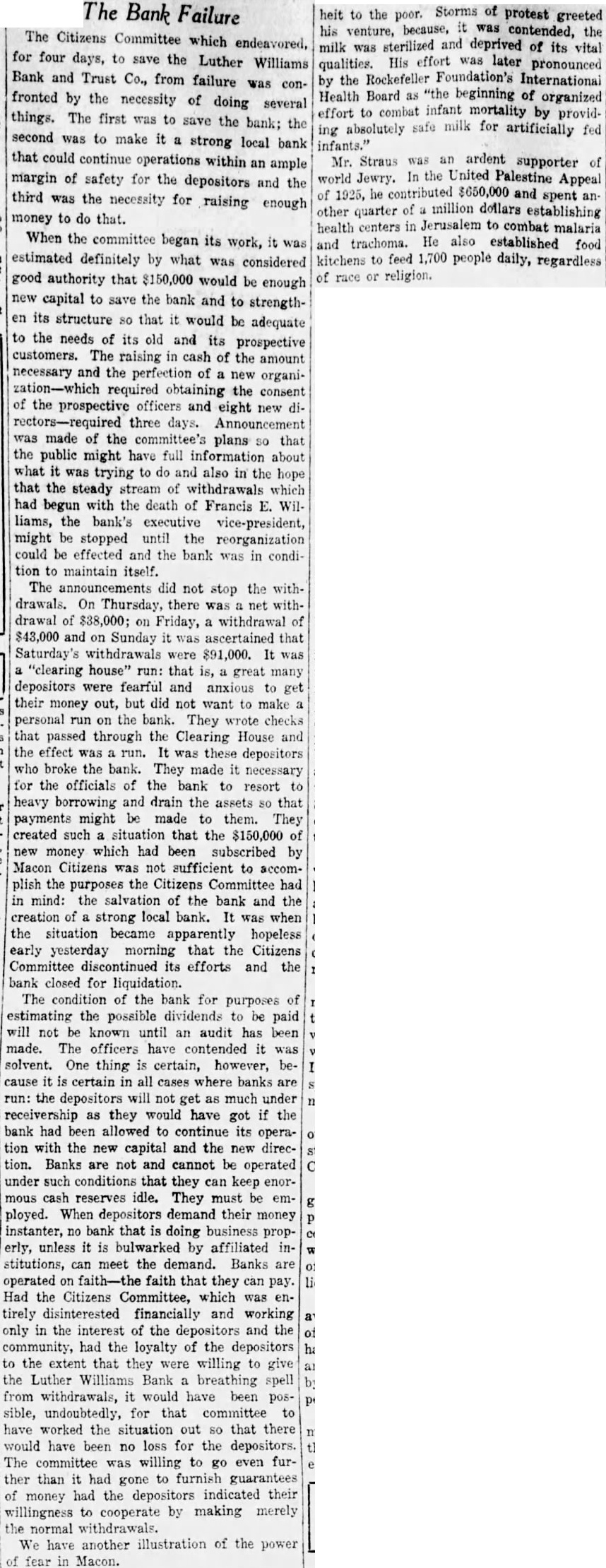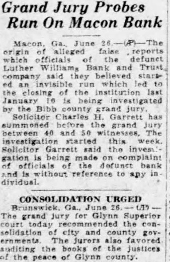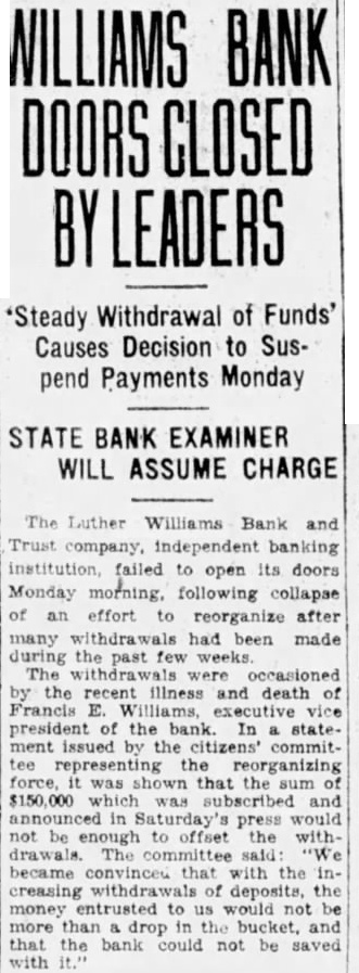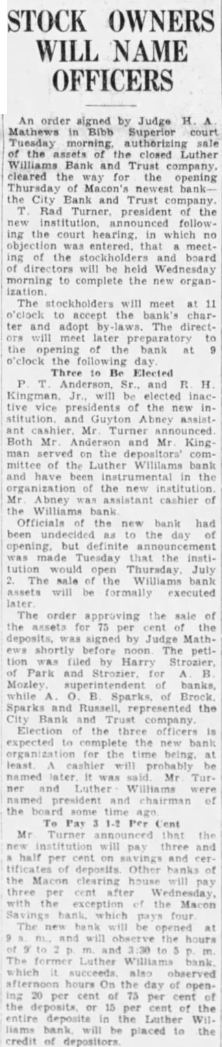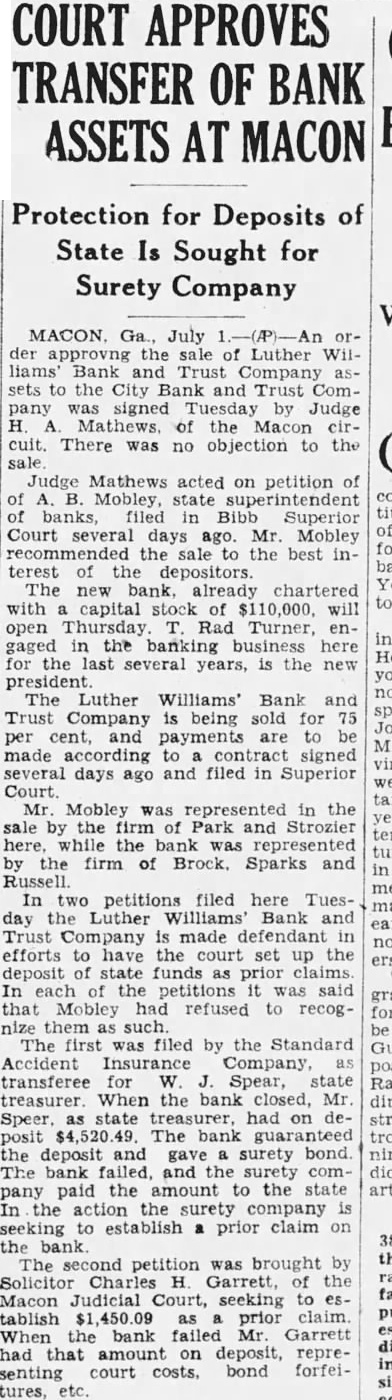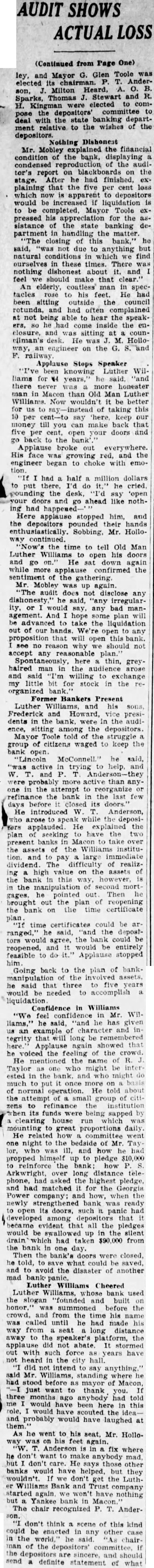 Dure Leon president the Fourth doors 1928, after disand while the lifted He briefly about the Luther Williams bank closing something about run which killed the Fourth that bank nothing Fourth. simply bank had board directors more He old how the bank was jeopardby rumors which began streets. directors called the night the morning the run Taylor, the federal there, and asked what the federal would the event the next federal take eligible Mr. Dure Mr. Taylor replied. "Eligible Small "Eligible of assets its value element in the bank $100,000 worth of bonds the state Georgia, $10,000 loan eligible said. not bank time 10 and Then the started People packed the the floor, upper tried communicate system appeal for help. unable Dure said, and the time Washington reached the telephone condition became telephone conversation which might meant salvation and close its doors failure care how solvent stitution Dure said, respond to run all funds vaults. If doing nothing (the Bank and Trust company) not reopened.' Burden Urges Reopening Mayor Toole Burthe agents refinance the before doors closed Burden urged the institution, said that would to power co-opthat effort King made the motion that the certificates posit.' the would not Mayor Toole asked for sentiment the to taking stock bank Many hands went he many would accept for deposits. Almost the Before the Mr. Mobley filing claims depositors, this in complicate the reopening bank, would on the contrary simplify matter workable plan should attained.