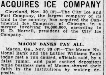 ACQUIRES ICE COMPANY Cleveland. Nov. 30 City Ice and Fuel in the has compa the Ice Norvell, president of the City Ice MACON BANKS PAY ALL Macon Na Bank and the officials rumor. and paid excited depositors showed in the institutions by making posits
