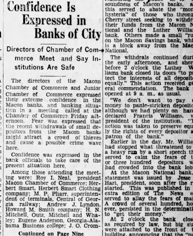 Confidence Is in Banks of City block away from the Directors of Chamber of The withdrals continued during merce Meet and Say early afternoon, and stitutions Are Safe before o'clock the Luther tect interests all depositors The directors of the Macon equally. This action received genChamber of Commerce and Junior commendation. bank eral The Chamber of Commerce opened a. m., usual. expressed their extreme confidence in "We don't want to Macon banks. and banking money to meeting called at the although had plenty on hand Chamber of Commerce Friday aft- declared Francis Williams. Fear was expressed that president the institution. recent of small de- was taken preserve equalpositors from the Macon banks the rights every depositor and might attract crowd thieves patron the bank.' Earlier the day Mr. Williams and cause possible crime wave here. had stopped what heavy run by short speech that Confidence was expressed the served calm the fears bank officials take care the three hundred depositors who present situation had into the bank Among those attending the meet- At the Macon National bank. ing were: Roy Neal, president statement was issued Jesse Macon Chamber Commerce: Hart, soon after bert Smart, Herbert Smart Clothing started. This was in M. Pharr, extra edition The News superintendent Central Geor- served to allay the fears of Andrew Lyndon, crowd of several hundred, railway; Howard Smith persisted in the determination Mitchell, Outz, Mitchell Wha- to their money o'clock the bank ley: Eugene Anderson, required law, but big bama Business Cromwere attached front the Continued on Page Nine building. that the