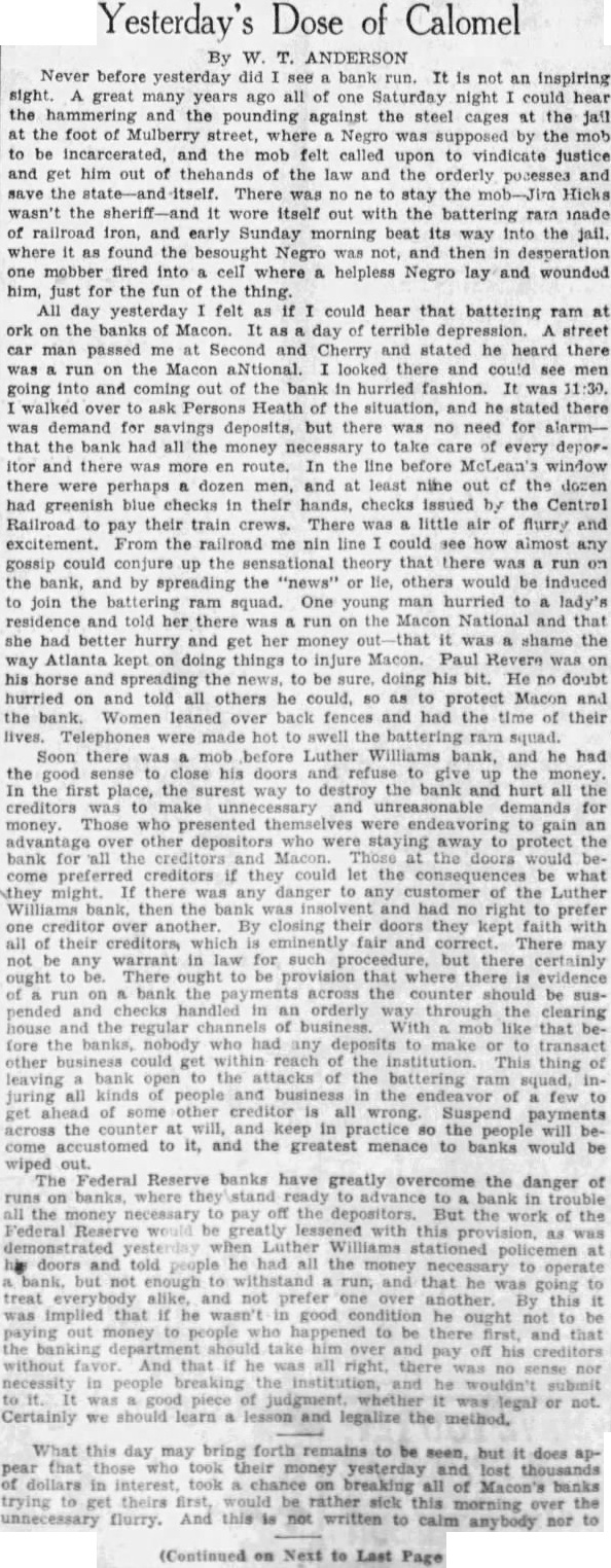 Yesterday's Dose of Calomel By W. T. ANDERSON Never before yesterday did bank It is not inspiring an sight. great many years ago all of one Saturday night could hear the hammering and the pounding against the steel cages at the the foot Mulberry street, where Negro supposed by the incarcerated, and the mob felt called upon vindicate justice and get him of thehands of the law and the orderly pocesses and the itself. There ne stay the Hicks wasn't the sheriff-and itself out with the battering ram inade of railroad and early Sunday morning beat its way into the jail. where found the besought Negro then in desperation one mobber fired into cell where helpless Negro lay and wounded for fun of the thing. All day yesterday felt as if could hear that battering ram at ork on the Macon. It as day terrible depression. street car man passed me at Second and Cherry and stated he heard there run on the Macon aNtional. looked there could see men going and coming of the bank in hurried fashion. It 11:30. walked ask Persons Heath the situation. and stated there demand for savings but there was no need for alarmthat the bank all the money take every deporitor there was more route. In the line window there were perhaps men, and least nine out of the dozen had greenish blue checks in their checks by the Railroad to pay their train crews. There was little air of flurry and excitement. From the railroad me nin could how almost any gossip up sensational that there run on the and by spreading the "news" others be induced to join the ram squad. young man hurried to lady's her on and that she had better hurry and get her money was shame the way Atlanta doing things to Macon. was on his and to his bit. He doubt hurried on and told all others he as to Macon and the Women and had the of their the there Luther and he had the and the In the first place, the hurt all the for money Those who gain advantage depositors who were away to protect the bank the the would bepreferred creditors if let the consequences be what they the Luther the and had prefer one By closing faith with their There may be warrant in law for such but there certainly ought There be provision where is evidence on the across the be susorderly clearing that before who had transact of thing the attacks of the battering leaving squad, all kinds people the of few to ahead wrong. Suspend payments across and in practice the will beto it, and the greatest menace to banks would be wiped Federal Reserve banks have greatly overcome the danger of runs on where all the money necessary to pay the depositors. But the work of the Federal Reserve greatly lessened with this was Luther stationed at doors and told people he had the to operate not and that was prefer over By this was implied that he wasn't in good not out money there that the banking and pay And he was sense nor submit or not. Certainly we legalize the method. What this day may bring forth remains to be does those who their money lost dollars in chance on all of Macon's banks trying to theirs would morning the flurry. written to nor to Page