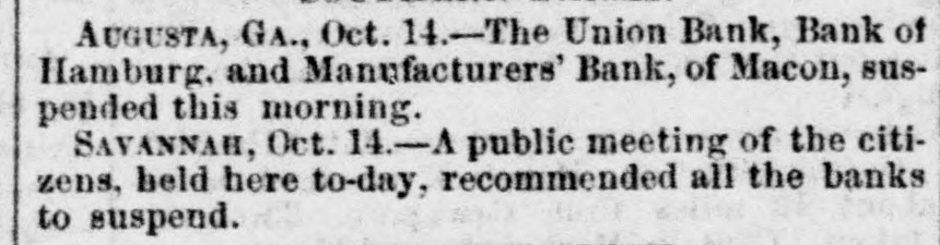 AUGUSTA, GA., Oct. 14.-The Union Bank, Bank of Hamburg. and Manufacturers' Bank, of Macon, suspended this morning. Savannah, Oct. 14.-A public meeting of the citizens, held here to-day, recommended all the banks to suspend.