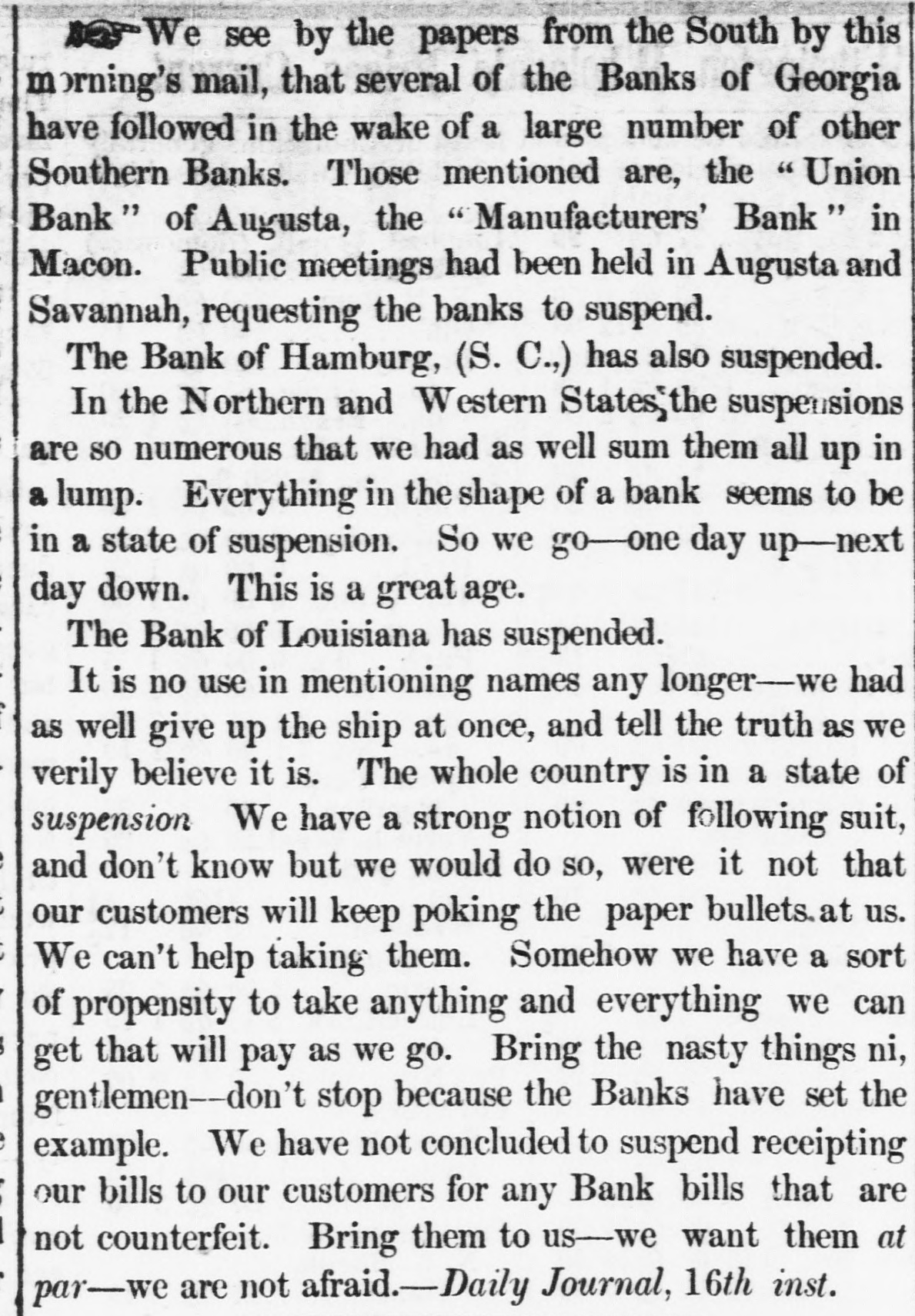 We see by the papers from the South by this m orning's mail, that several of the Banks of Georgia have followed in the wake of a large number of other Southern Banks. Those mentioned are, the "Union Bank" of Augusta, the "Manufacturers' Bank" in Macon. Public meetings had been held in Augusta and Savannah, requesting the banks to suspend. The Bank of Hamburg, (S. C.,) has also suspended. In the Northern and Western States'the suspensions are so numerous that we had as well sum them all up in a lump. Everything in the shape of a bank seems to be in a state of suspension. So we go-one day up-next day down. This is a great age. The Bank of Louisiana has suspended. It is no use in mentioning names any longer-we had as well give up the ship at once, and tell the truth as we verily believe it is. The whole country is in a state of suspension We have a strong notion of following suit, and don't know but we would do so, were it not that our customers will keep poking the paper bullets. at us. We can't help taking them. Somehow we have a sort of propensity to take anything and everything we can get that will pay as we go. Bring the nasty things ni, gentlemen--don't stop because the Banks have set the example. We have not concluded to suspend receipting our bills to our customers for any Bank bills that are not counterfeit. Bring them to us-we want them at par-we are not afraid.-Daily Journal, 16th inst.