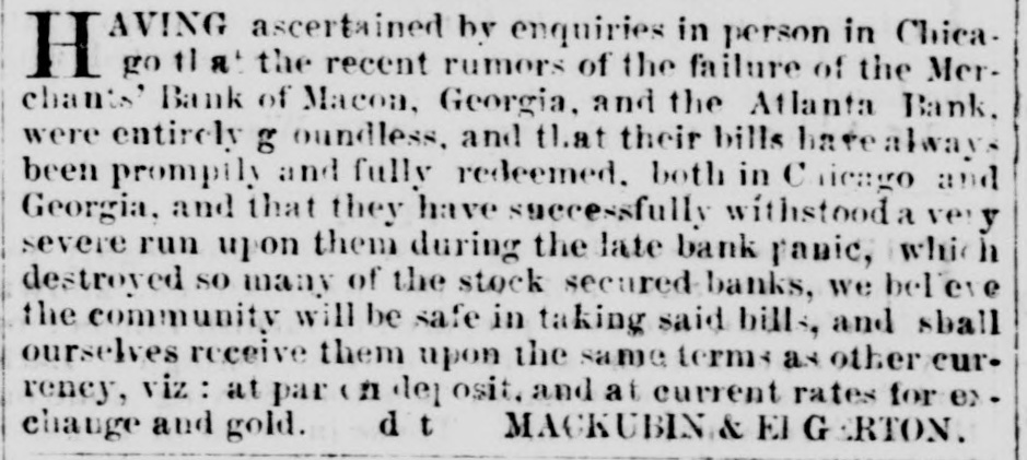 the recent rumors of the failure of the Merchants' Bank of Macon, Georgia, ... were entirely groundless, and that their bills have always been promptly and fully redeemed ... they have successfully withstood a very severe run upon them during the late bank panic