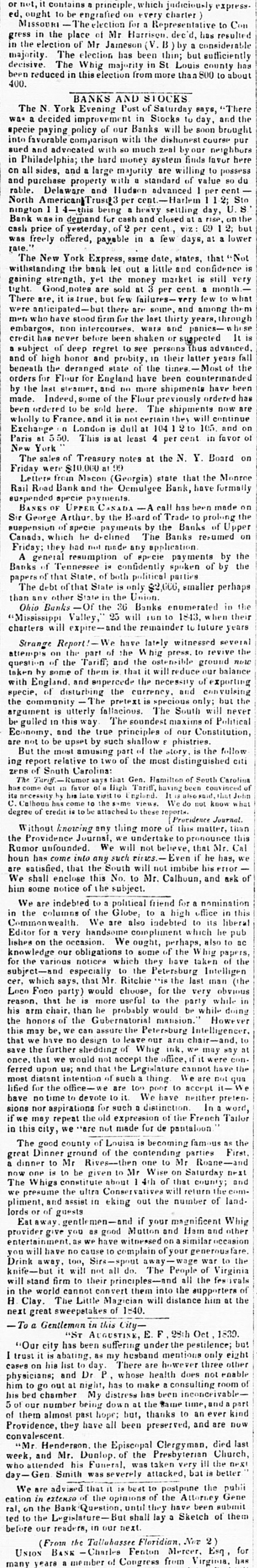 express. judiciously to Con it contains principle, on every Representative charter Harrisen. ed, ought 1 or not, to be The election engrafied for dec considerable has resulted MISSOURI in the place Mr of Jameson Mr (V. thin; B) by but a sufficiently has gress in the election of election has been St Louis county about 400. been decisive. reduced in this majority The The Whig election majority from in more than 800 to "There says, Evening BANKS AND Post STOCKS of Saturday to and the Stocks day, The decided N. York improvement Banks in ill be soon course brought pur and hard was a paying policy of our with the dishonest by our neighburs here money to willing into specie favorable advocated comparison with much system zeal finds vor possess du sued in Philadelphia; and the large with majority a standard of value per cent so on all purchase sides, property and Hudson advanced U. Sto S and rable. American Delaware Trust3 percent. heavy seitling day, rise on the was nington North 1 4-this demand being for cash and cent, closed viz: 69 at a 2; lower but Not date, cash Bank freely price was of in offered, vesterday payable of 2 per in few states, days, that is confidence rate. New York bank Express, let out same a little market and is still very withstanding The strength, the yet the money at 3 per cent few a month to that have gaining Good,notes are but sold few failures- some. and very among through the m men who non intercourses or shaken were There tight. anticipated-b are, it true. there for the are thirty panics- years, hose It is suspected of Thus subject of and high honor probity. the state credit embargos, has never deep before beer regret Most years of the fall orders last been the by stramer, of the some Flour made. Indeed, sold beneath and the Flour deranged for England and no more have shipments ordered have are now to be The here. shipments will continue on 105. and Exchange at 50. This Paris New York been wholly ordered to France. 0 London and dull not least at 4 104 to in favor of of on at Y. N. the notes Board Treasury the Monroe specie Rail Lettere from Road Bank and payments. the Friday The sales were Macon 000 (Georgin) Oemulgee state Bank, that have formally on been has made the Sir prolong George of specie payments suspension The he which drelined Banks Canada. suspended BANKS OF Arthur. UPPER C NACA by the Board by of the Banks resumed of Jpper on not had made they Friday; the A by sprcie general resumption of the by spoken Tennessee confidently parties political smaller perhaps Banks papers of of that State State of both is only $2,000, in the The debt of that State in the Union. Banks enumerated their when "Mississippi and the will expirethan Ohio any Banks other Valley, Of the 25 36 will remainder 10 1843, 10 future years have Revers lately the to revive question is of them by taken some charters Strange Report part We of the whig ostenrible ground our alance now the and with England. enpercede necessity attempts of on the the Tariff; and that the it will reduce of exporting of and the unvulsing specie, disturbing currency. is but the the pretext only; community will The never South utterly fallacious. of The maxims soundest Political Constitution, follow argument be gulled in is this way the true principles shallow phistries. our the But the ing relative report South Carolina: of Gen. South are Economy not to be most and upset amusing by such of the of the most story distinguished is citi Hamilton Carolina of been come convention late Julin that credit zens The of Tariff in Rumor favor High Tariff, We do not know what the has c. Calhous necessity his come is 10 attached to these of Procidence this matter, Journal than this Providence We will if he cinvs. Even degree Without of knowing Journal, any thing we not more believe, prenounce that Mr. has, Cal we his error of We are shall enclose of he subject. hour Rumor satisfied. has unfounded come that into the this any South No. such to will Mr. not Calhoun, imbibe and ask a for nomination in this wealth. him some indebted notice to a political to friend high to office its libera in We the are columns We the are Globe; also indebted which also he to pub ac Common for a very handsome We ought, of perhaps. the Whig paper of the Petersburg lishes Editor on the our occasion. obligations which to some they have taken Intelliger (the knowledge for the various especially notices to Ritchie the **is the the last very man obvious in that he subject-and which says. that would choose, to for the party while doing cer. Loco Foco party) he is more probably useful would be while However to that reason. his arm chair. of the than Gubernature the chair-and. the save further we not accept the honors be, we can assure leave our ink, arm WP may any con- at once. would the and ferred cannot upon this may we have no shedding design Whig the office, if were have Legislature We not are most qua thing distant intention to for the We lified it poor accept office-we to time neither have devote pretenIn nor sions word, distinction. aspirations if the the Tailor may repeat French in we not made city, pantaloon as of the The Louisa famous county good becoming of the First Dinner ground parties great contending Mr a to Mr Roan dinner is to on be Wise one now next given Saturday of 4th that and The Whigs county; constitute the the comwe return ultra presume of the in out and assist landeking number pliment, guests if your Whig magnificent and other Hain entertain lords Eat or of you as good witnessed Mutton and no will you cause 100, Drink Sirsaway. of do. will The not People provider give WP have complain your war Virginia to the all the ferrivals the of supporters Clay. in the The Little of 1840. knife-bu will stand world firm it cannot to their convert Magician principles them will into distance him at the I is trust next H To great a Genilemnn sweepetakes "ST in AUGUSTINE, this City- under E. 25th the pestilence; Oct only 1839. to list on his day. P 