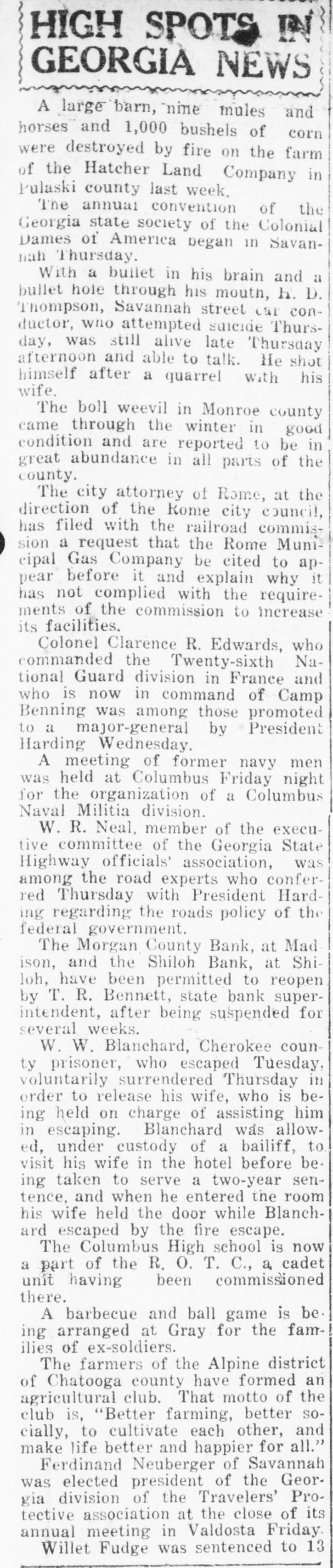 HIGH SPOTS GEORGIA NEWS A large barn, nine mules and horses and 1,000 bushels of corn were destroyed by fire on the farm of the Hatcher Land Company in Pulaski county last week. The annual convention of the Georgia state society of the Colonial Dames of America began in Savannah Thursday. With a bullet in his brain and a bullet hole through his mouth, h. D. Thompson, Savannah street car conductor, who attempted suicide Thursday, was still alive late Thursday afternoon and able to talk. He shot himself after a quarrel with his wife. The boll weevil in Monroe county came through the winter in good condition and are reported to be in great abundance in all parts of the county. The city attorney of Rome, at the direction of the Rome city council, has filed with the railroad commission a request that the Rome Mumcipal Gas Company be cited to appear before it and explain why it has not complied with the requirements of the commission to increase its facilities. Colonel Clarence R. Edwards, who commanded the Twenty-sixth National Guard division in France and who is now in command of Camp Benning was among those promoted to a major-general by President Harding Wednesday. A meeting of former navy men was held at Columbus Friday night for the organization of a Columbus Naval Militia division. W. R. Neal, member of the executive committee of the Georgia State Highway officials' association, was among the road experts who conferred Thursday with President Harding regarding the roads policy of the federal government. The Morgan County Bank, at Mad ison, and the Shiloh Bank, at Shiloh, have been permitted to reopen by T. R. Bennett, state bank superintendent, after being suspended for several weeks. W. W. Blanchard, Cherokee county prisoner, who escaped Tuesday, voluntarily surrendered Thursday in order to release his wife, who is being held on charge of assisting him in escaping. Blanchard was allowed, under custody of a bailiff, to visit his wife in the hotel before be. ing taken to serve a two-year sentence, and when he entered the room his wife held the door while Blanchard escaped by the fire escape. The Columbus High school is now a part of the R. O. T. C., a cadet unit having been commissioned there. A barbecue and ball game is be ing arranged at Gray for the families of ex-soldiers. The farmers of the Alpine district of Chatooga county have formed an agricultural club. That motto of the club is, "Better farming, better socially, to cultivate each other, and make life better and happier for all." Ferdinand Neuberger of Savannah was elected president of the Georgia division of the Travelers' Protective association at the close of its annual meeting in Valdosta Friday Willet Fudge was sentenced to 13
