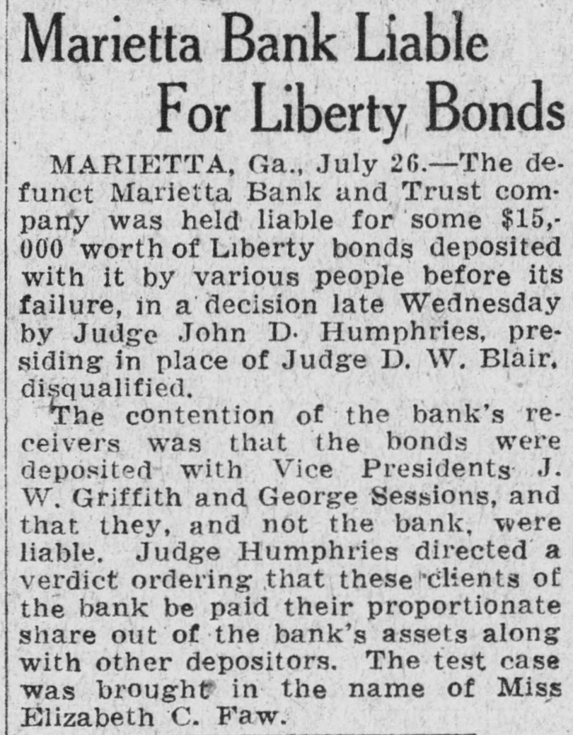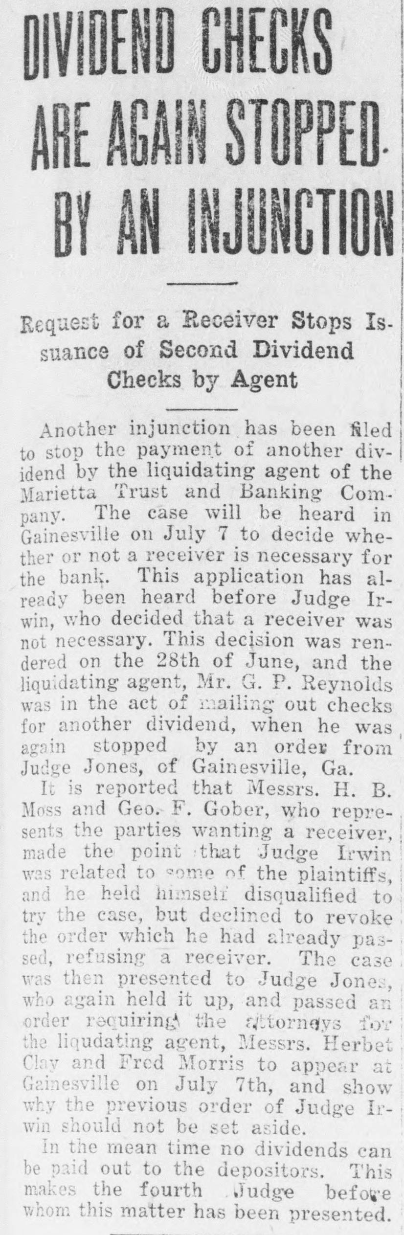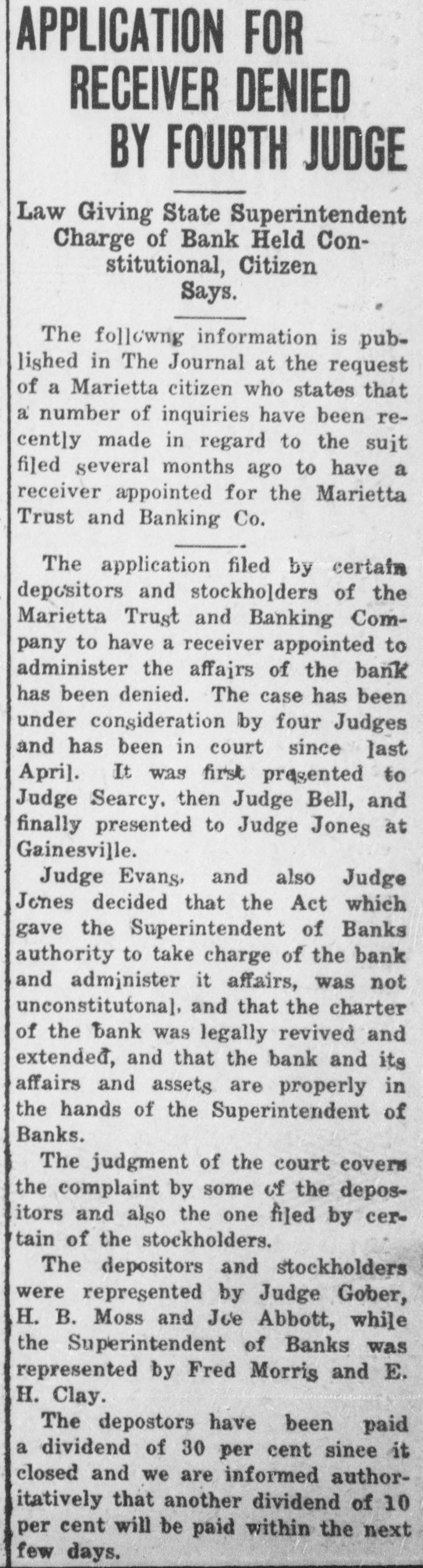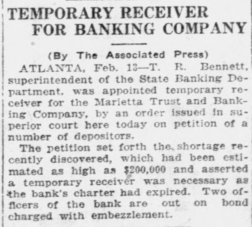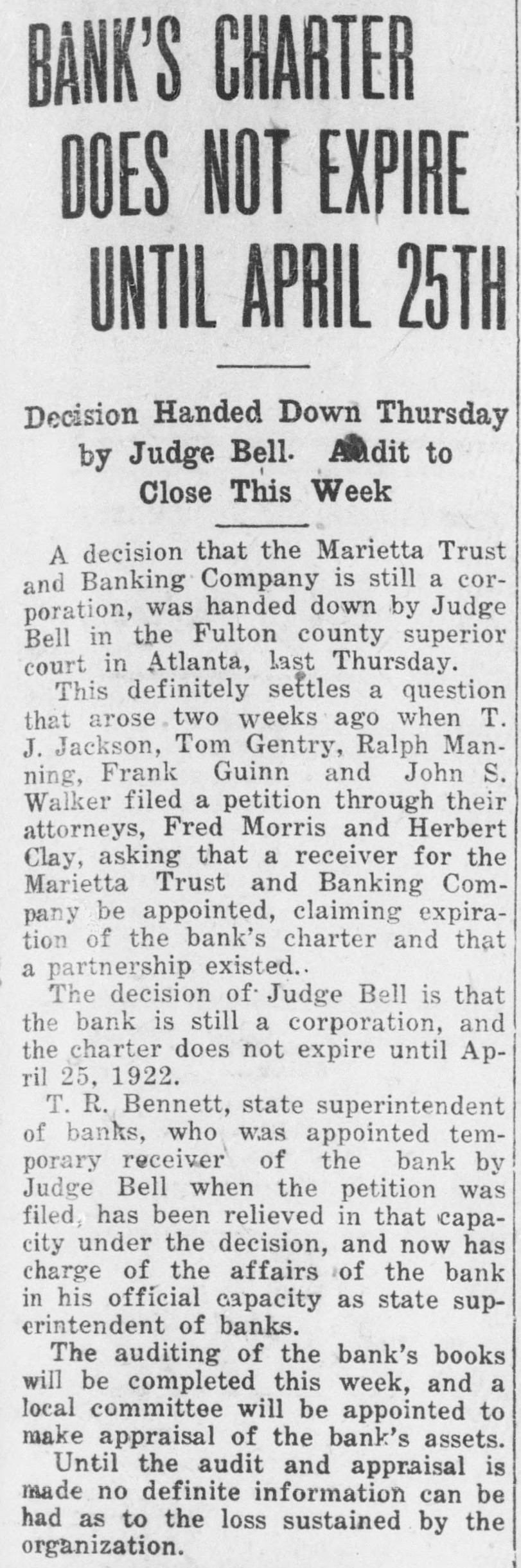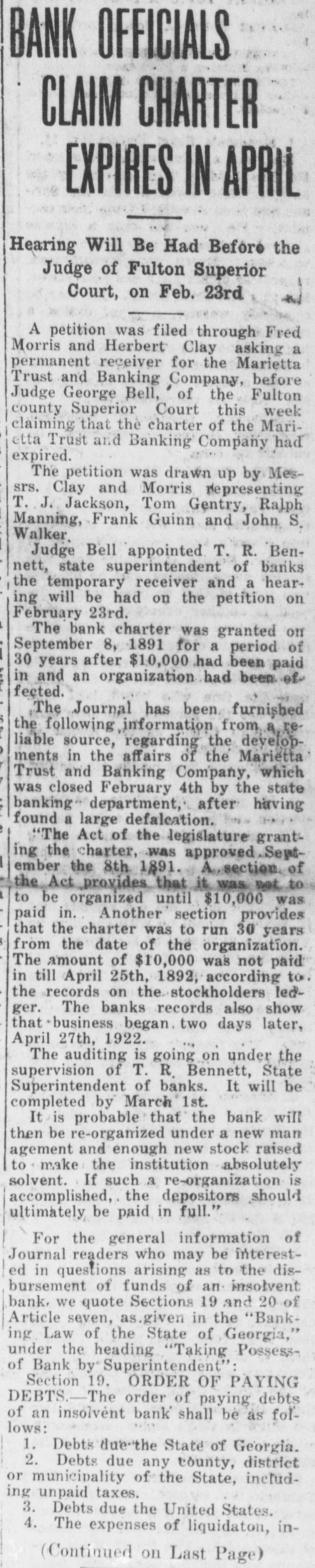 BANK OFFICIALS CLAIM CHARTER EXPIRES IN APRIL Hearing Will Be Had Before the Judge of Fulton Superior Court, on Feb. 23rd A petition was filed through Fred Morris and Herbert Clay asking a permanent receiver for the Marietta Trust and Banking Company, before Judge George Bell, of the Fulton county Superior Court this week claiming that the charter of the Marietta Trust and Banking Company had expired. The petition was drawn up by Messrs. Clay and Morris representing T. J. Jackson, Tom Gentry, Ralph Manning, Frank Guinn and John S Walker Judge Bell appointed T. R. Bennett, state superintendent of banks the temporary receiver and a hearing will be had on the petition on February 23rd. The bank charter was granted Off September 8, 1891 for a period of 30 years after $10,000 had been paid in and an organization had been of fected. The Journal has been. furnished the following information from reliable source, regarding the developments in the affairs of the Marietta Trust and Banking Company, which was closed February 4th by the state banking department, after having found a large defalcation. 'The Act of the legislature granting the charter, was approved September the 8th 1891. A. section. of the Act provides that it was not to to be organized until $10,000 was paid in. Another section provides that the charter was to run 30 years from the date of the organization. The amount of $10,000 was not paid in till April 25th, 1892, according to the records on the stockholders ledger. The banks records also show that business began. two days later, April 27th, 1922. The auditing is going on under the supervision of T. R Bennett, State Superintendent of banks. It will be completed by March 1st. It is probable that the bank will then be re-organized under a new man agement and enough new stock raised to make the institution absolutely solvent. If such a re-organization is accomplished, the depositors should ultimately be paid in full." For the general information of Journal readers who may be interested in questions arising as to the disbursement of funds of an insolvent bank. we quote Sections 19 and 20 of Article seven, as given in the "Banking Law of the State of Georgia," under the heading "Taking Possessof Bank by Superintendent' Section 19. ORDER OF PAYING DEBTS.-The order of paying debts of an insolvent bank shall be as follows: 1. Debts due the State of Georgia. 2. Debts due any county, district or municipality of the State, including unpaid taxes. 3. Debts due the United States. 4. The expenses of liquidaton, in(Continued on Last Page)