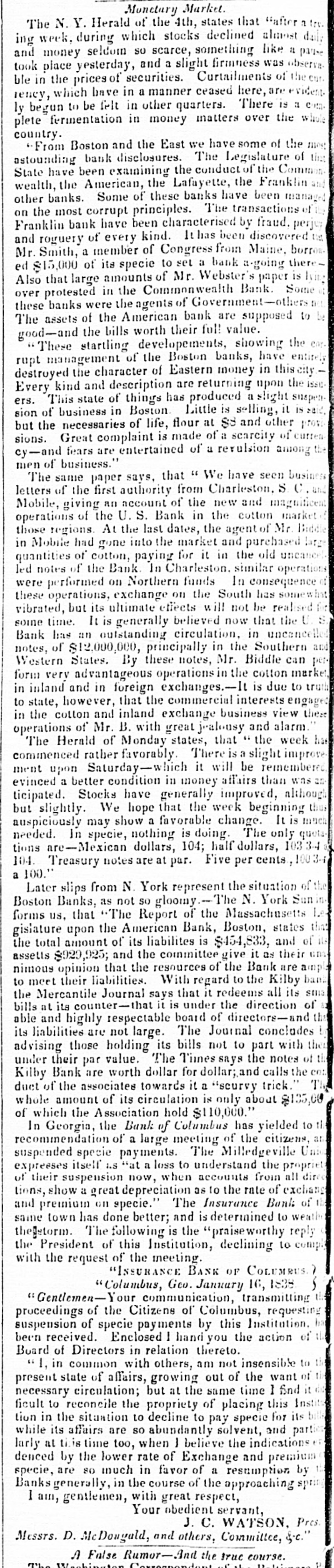 Munctary Market. The N. Y. Herald of the 4th, states that "after ing week, during which stocks declined almost date and money seldom so scarce, something like a pause took place yesterday, and a slight firmness was observa ble in the prices of securities. Curtailments of the which have in a manner ceased here, are evident. Com ly rency, begun to be felt in other quarters. There is a plete fermentation in money matters over the whole country. From Boston and the East we have some of the bank disclosures. The Legislature of astounding have been examining the conduct of the Common State wealth, the American, the Lafayette, the Franklin banks. Some of these banks have been managed other the most corrupt principles. The transactions of on Franklin bank have been characterised by fraud. perjo of every kind. has been discovered and Mr. Smith, roguery a member of Congress from Maine, borro ed $15,000 of its specie to set a bank a-going there Also that large amounts of Mr. Webster's paper Some is Ivia protested in the Commonwealth Bank. over banks were the agents of Government-others to these The assets of the American bank are supposed good-and the bills worth their full value. These startling developments, showing the management of the Boston banks, have entirely rupt the character of Eastern money in this city the destroyed kind and description are returning upon ISSC Every This state of things has produced a slight suspen ers. of business in Boston Little is selling, it is sion the necessaries of life, flour at S8 and other prove but Great complaint is made of a scarcity of curren sions. cy-and fears are entertained of a revulsion among men of business." The same paper says, that " We have seen business letters of the first authority from Charleston, C. Mobile, giving an account of the new and inagnificent market operations of the U. S. Bank in the cotton those regions At the last dates, the agent of Mr. Bidd in Mobile had gone into the market and purchased lare quantities of cotton, paying for it in the old uncance led notes of the Bank In Charleston. similar operations were performed on Northern funds In consequence these operations, exchange on the South has somewhat vibrated, but its ultimate effects will not be realised time. It is generally believed now that the U some Bank has an outstanding circulation, in uncancello of $12,000,000, principally in the Southern notes, Western States. By these notes, Mr. Biddle can advantageous operations in the cotton market and in foreign exchanges.-10 is that the commercial engaged in form state, inland very however, interests due view to these tru to in the cotton and inland exchange business operations of Mr. B. with great jealousy and alarm.' of Monday states, that rather favorably. There is a commenced The Herald be slight the remembered week improve Saturday-which it will a better condition in money was evinced ment upon improved, affairs than ticipated. Stocks have generally although but slightly. We hope that the week beginning thus auspiciously may show a favorable change. It is much needed. In specie, nothing is doing. The only quota tions are-Mexican dollars, 104; half dollars, 103 1003 104. Treasury notes are at par. Five per cents, a 100.' Later slips from N. York represent the situation Sun of Banks, as not so gloomy-- - The N. York forms Boston us. that The Report of the Massachusetts gistature upon the American Bank, Boston, states of the total amount of its liabilities is $454,833, and their assetts $929,925; and the committee give it as nimous opinion that the resources of the Bank are amp bank their liabilities. With regard to the Kilby sme to meet Mercantile Journal says that it redeems all its of the its counter-that it is under the direction able bills at and highly respectable board of directors-and its liabilities are not large. The Journal concludes those holding its bills not to part with the under advising their par value. The Times says the notes the of con Bank are worth dollar for dollar; and calls T duet Kilby of the associates towards it a "scurvy trick." whole amount of its circulation is only about $135,00 of the Association hold $110,000." the Bank of Columbus has to at In which Georgia, yielded citizens, recommendation of a large meeting of the Uni payments. The Milledgeville suspended specie understand from the itself I.S "at a loss to propriet all dir expresses their suspension now, when accounts of tions, show a great depreciation as to the rate Bank of exchang of and premium on specie." The Insurance wealth town has done better; and is determined to same the Set orm. The following is the "praiseworth reply the President of this Institution, declining to comp with the request of the meeting. BANK OF COLUMBUS Gco. January "Columbus, "ISSURANCE transmitting 16, 1838 Gentlemen-Yo communication, proceedings of the Citizens of Columbus, requesting suspension of specie payments by this Institution of been received. Enclosed I hand you the action Board of Directors in relation thereto. "1, in common with others, am not insensible to of state of affairs, growing out of the 1 want find it present circulation; but at the same time Instit ficult necessary to reconcile the propriety of placing this its tion in the situation to decline to pay specie for affairs are so abundantly solvent, and part at this time too, when I believe the larly denced while its by indications the lower rate of Exchange and premium by specie, are so much in favor of a resumption Banks generally, in the course of the approaching sprit I am, gentlemen, with great respect, Your inbedient servant, J. C. WATSON. Pres Messrs. D. (cDougald, and others, Committee, &.c." False Rumor-And the true course.