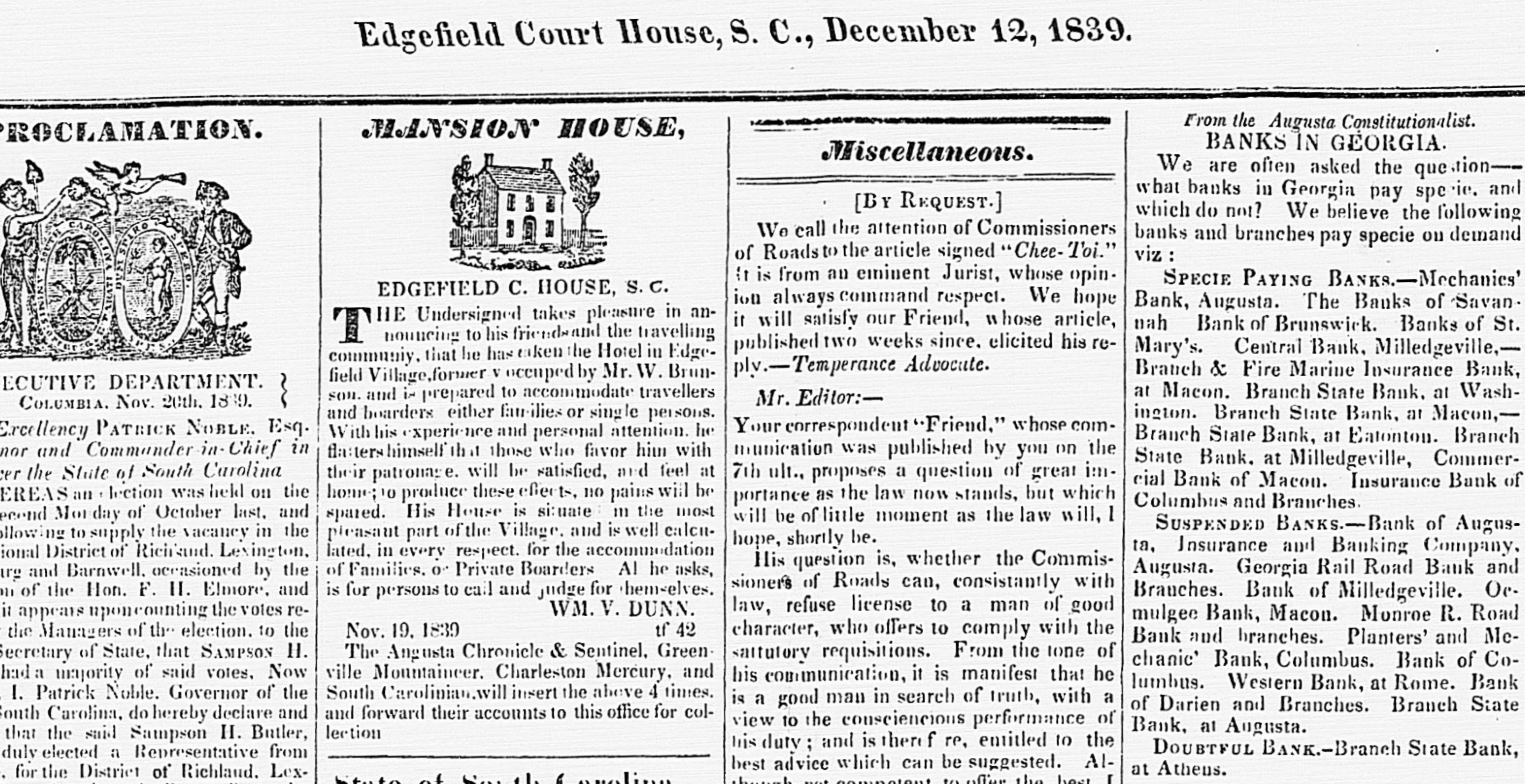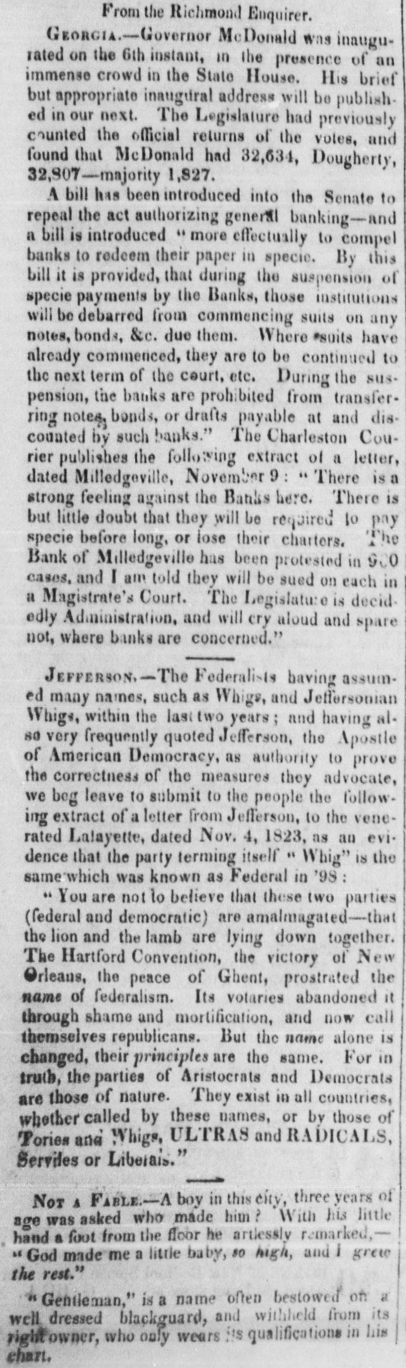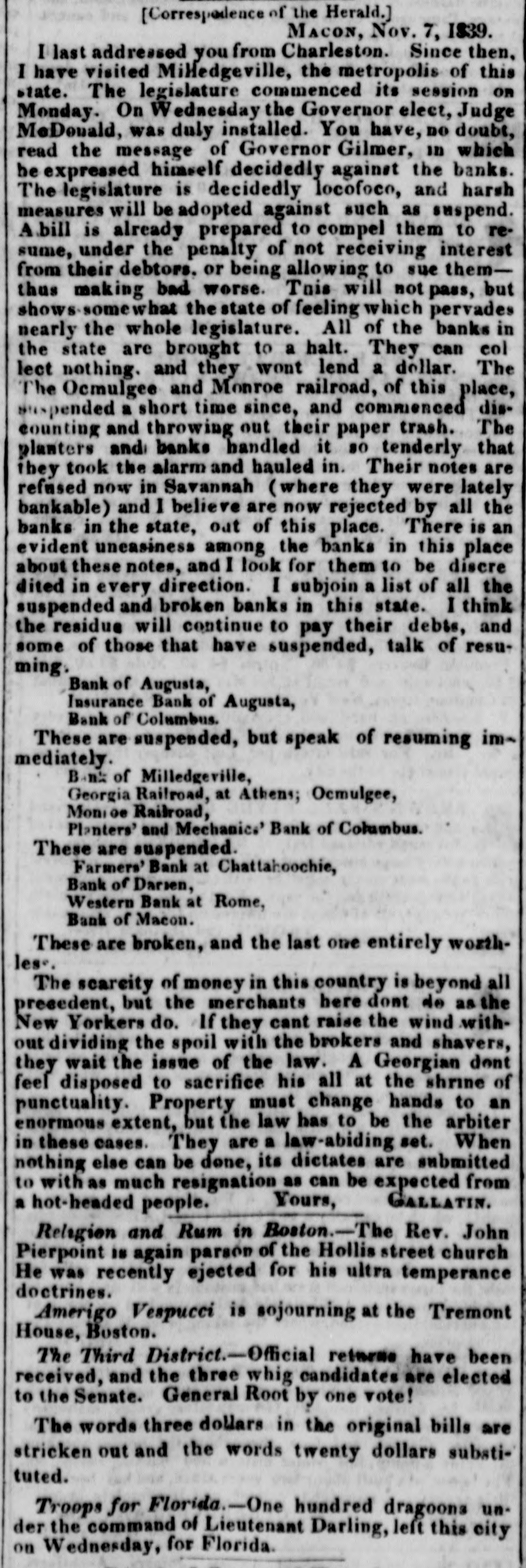 [Correspedence of the Herald.] Macon, Nov. 7, I$39. I last addressed you from Charleston. Since then, I have visited MiHedgeville, the metropolis of this state. The legislature commenced its session OR Monday. On Wednesday the Governor elect, Judge McDonald, was duly installed. You have, DO doubt, read the message of Governor Gilmer, in which he expressed himself decidedly against the banks. The legislature is decidedly locofoco, and harsh measures will be adopted against such as suspend. A.bill is already prepared to compel them to resume, under the penalty of not receiving interest from their debtors. or being allowing to sue themthus making bad worse. This will not pass, but shows somewhat the state of feeling which pervades nearly the whole legislature. All of the banks in the state are brought to a halt. They can col lect nothing. and they wont lend a dollar. The The Ocmulgee and Monroe railroad, of this place, spended a short time since, and commenced discounting and throwing out their paper trash. The planters and banks handled it so tenderly that they took the alarm and hauled in. Their notes are refused now in Savannah (where they were lately bankable) and I believe are now rejected by all the banks in the state, out of this place. There is an evident uneasiness among the banks in this place about these notes, and I look for them to be discre dited in every direction. I subjoin a list of all the suspended and broken banks in this state. I think the residue will continue to pay their debts, and some of those that have suspended, talk of resuming. Bank of Augusta, Insurance Bank of Augusta, Bank of Columbus. These are suspended, but speak of resuming immediately. Bank of Milledgeville, Georgia Railroad, at Athens; Oemulgee, Monioe Railroad, Planters' and Mechanic.' Bank of Columbus. These are suspended. Farmers' Bank at Chattahoochie, Bank of Darsen, Western Bank at Rome, Bank of Macon. These are broken, and the last one entirely worthles The scarcity of money in this country is beyond all precedent, but the merchants here dont do as the New Yorkers do. If they cant raise the wind without dividing the spoil with the brokers and shavers, they wait the issue of the law. A Georgian dont feel disposed to sacrifice his all at the shrine of punctuality. Property must change hands to an enormous extent, but the law has to be the arbiter in these cases. They are a law-abiding set. When nothing else can be done, its dictates are submitted to with as much resignation as can be expected from a hot-headed people. Yours, GALLATIN. Religion and Rum in Boston.-The Rev. John Pierpoint is again parson of the Hollis street church He was recently ejected for his ultra temperance doctrines. Amerigo Vespucci is sojourning at the Tremont House, Boston. The Third District.-Official returns have been received, and the three whig candidates are elected to the Senate. General Root by one vote! The words three dollars in the original bills are stricken out and the words twenty dollars substituted. Troops for Florida. - One hundred dragoons under the command of Lieutenant Darling, left this city on Wednesday, for Florida.