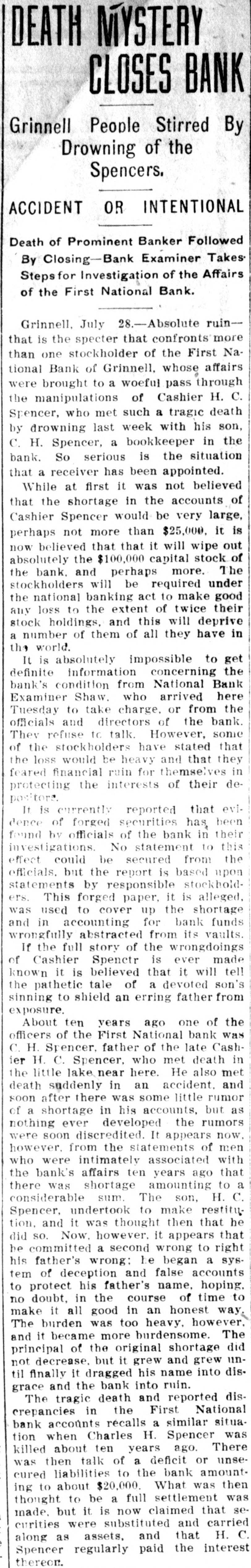 DEATH MYSTERY CLOSES BANK Grinnell People Stirred By Drowning of the Spencers. ACCIDENT OR INTENTIONAL Death of Prominent Banker Followed By Closing-Bank Examiner Takes Stepsfor Investigation of the Affairs of the First National Bank. Grinnell, July 28.-Absolute ruinthat is the specter that confronts more than one stockholder of the First National Bank of Grinnell, whose affairs were brought to a woeful pass through the manipulations of Cashier H. C. Spencer, who met such a tragic death by drowning last week with his son, C. H. Spencer, a bookkeeper in the bank. So serious is the situation that a receiver has been appointed. While at first it was not believed that the shortage in the accounts of Cashier Spencer would be very large, perhaps not more than $25,000, it is now believed that that it will wipe out absolutely the $100,000 capital stock of the bank. and perhaps more. The stockholders will be required under the national banking act to make good any loss to the extent of twice their stock holdings, and this will deprive a number of them of all they have in the world. It is absolutely impossible to get definite information concerning the bank's condition from National Bank Examiner Shaw. who arrived here Tuesday to take charge. or from the officials and directors of the bank. They refuse tc talk. However, some of the stockholders have stated that the loss would be heavy and that they feared financial ruin for themselves in protecting the interests of their depositors. It is currently reported that evidence of forged securities has been found by officials of the bank in their investigations. No statement to this effect could be secured from the efficials. but the report is based upon statements by responsible stockholders. This forged paper, it is alleged, was used to cover up the shortage and in accounting for bank funds wrongfully abstracted from its vaults. If the full story of the wrongdoings of Cashier Spenctr is ever made known it is believed that it will tell the pathetic tale of a devoted son's sinning to shield an erring father from exposure. About ten years ago one of the officers of the First National bank was C. H. Spencer, father of the late Cashiom U.