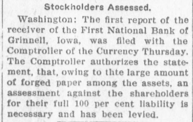 Stockholders Assessed. Washington: The first report of the receiver of the First National Bank of Grinnell, Iowa, was filed with the Comptroller of the Currency Thursday. The Comptroller authorizes the statement, that, owing to thte large amount of forged paper among the assets, an assessment against the shareholders for their full 100 per cent liability is necessary and has been levied.