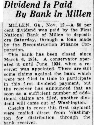 Dividend Is Paid By Bank in Millen MILLEN. Ga., Nov. 50 per dividend the Bank Millen depositors Saturday, through loan made the Reconstruction Finance Cor. poration This bank has been closed since March conservator operuntil when ceiver was appointed. There are still some claims the which first but has that the number addianother come out of Washington Checks cover this first payment mailed direct for distribution through the receiver