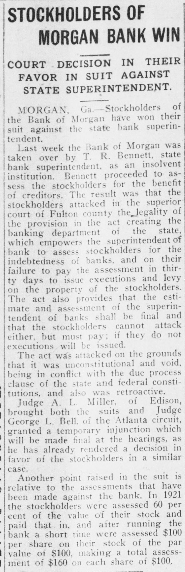 # STOCKHOLDERS OF # MORGAN BANK WIN COURT DECISION IN THEIR FAVOR IN SUIT AGAINST STATE SUPERINTENDENT. MORGAN, Ga. - Stockholders of the Bank of Morgan have won their suit against the state bank superintendent. Last week the Bank of Morgan was taken over by T. R. Bennett, state bank superintendent, as an insolvent institution. Bennett proceeded to assess the stockholders for the benefit of creditors. The result was that the stockholders attacked in the superior court of Fulton county the legality of the provision in the act creating the banking department of the state, which empowers the superintendent of bank to assess stockholders for the indebtedness of banks, and on their failure to pay the assessment in thirty days to issue executions and levy on the property of the stockholders. The act also provides that the estimate and assessment of the superintendent of banks shall be final and that the stockholders cannot attack either, but must pay; if they do not executions will be issued. The act was attacked on the grounds that it was unconstitutional and void, being in conflict with the due process clause of the state and federal constitutions, and also was retroactive. Judge A. L. Miller, of Edison, brought both the suits and Judge George L. Bell, of the Atlanta circuit, granted a temporary injunction which will be made final at the hearings, as he has already rendered a decision in favor of the stockholders in a similar case. Another point raised in the suit is relative to the assessments that have been made against the bank. In 1921 the stockholders were assessed 60 per cent of the value of their stock and paid that in, and after running the bank a short time were assessed $100 per share on their stock of the par value of $100, making a total assessment of $160 on each share of $100.