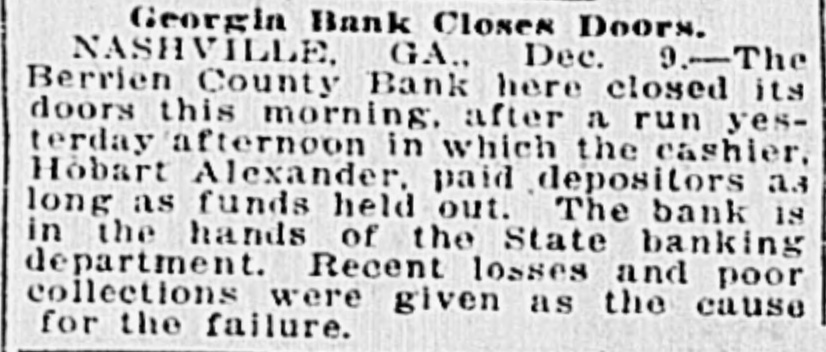 Georgia Bank Closes Doors. NASHVILLE. GA., Dec. 9.-The Berrien County Bank here closed its doors this morning, after a run yesterday afternoon in which the cashier, Hobart Alexander, paid depositors as long as funds held out. The bank is in the hands of the State banking department. Recent losses and poor collections were given as the cause for the failure.