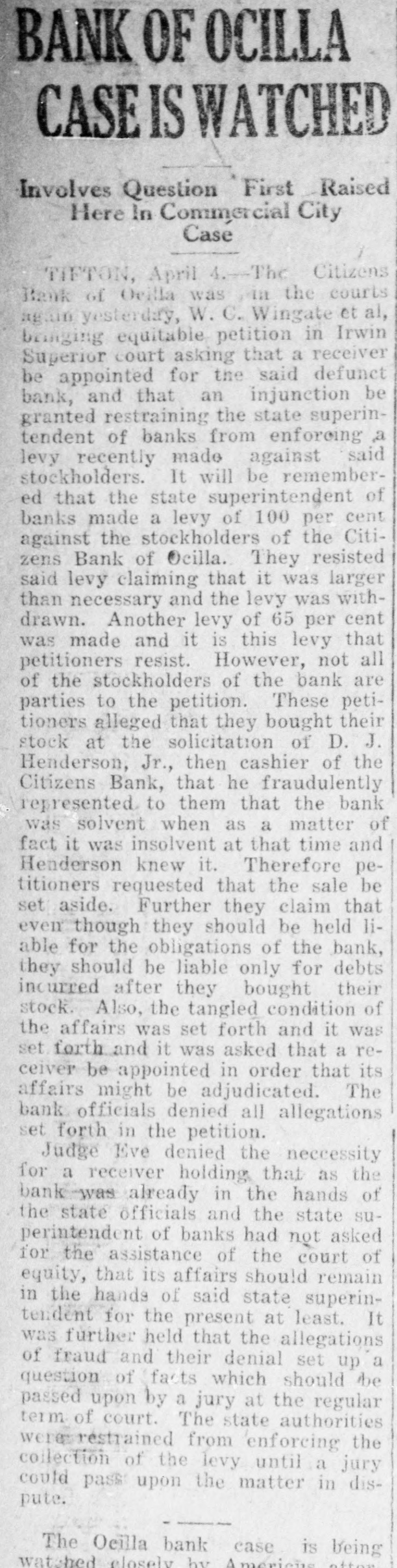 BANK OF OCILLA CASE IS ATCHED Involves Question First Raised Here In Commercial City Case TIFTON, April 4. The Citizens Bank of Oeilla was la the courts again yesterday, W. C. Wingate et al, bringing equitable petition in Irwin Superior court asking that a receiver be appointed for the said defunct bank, and that an injunction be granted restraining the state superintendent of banks from enforcing a levy recently made against said stockholders. It will be remembered that the state superintendent of banks made a levy of 100 per cent against the stockholders of the Citizens Bank of Ocilla. They resisted said levy claiming that it was larger than necessary and the levy was withdrawn. Another levy of 65 per cent was made and it is this levy that petitioners resist. However, not all of the stockholders of the bank are parties to the petition. These petitioners alleged that they bought their stock at the solicitation of D. J. Henderson, Jr., then cashier of the Citizens Bank, that he fraudulently represented to them that the bank was solvent when as a matter of fact it was insolvent at that time and Henderson knew it. Therefore petitioners requested that the sale be set aside. Further they claim that even though they should be held liable for the obligations of the bank, they should be liable only for debts incurred after they bought their stock Also, the tangled condition of the affairs was set forth and it was set forth and it was asked that a receiver be appointed in order that its affairs might be adjudicated. The bank officials denied all allegations set forth in the petition. Judge Eve denied the neccessity for a receiver holding that as the bank was already in the hands of the state officials and the state superintendent of banks had not asked for the assistance of the court of equity, that its affairs should remain in the hands of said state superintendent for the present at least. It was further held that the allegations of fraud and their denial set up a question of facts which should be passed upon by a jury at the regular term of court. The state authorities were réstrained from enforcing the collection of the levy until a jury could pass upon the matter in dispute. The Oeilla bank case is being watched closely by Americies attor