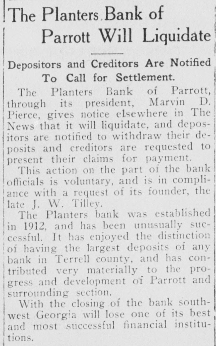 The Planters. Bank of Parrott Will Liquidate Depositors and Creditors Are Notified To Call for Settlement. The Planters Bank of Parrott, through its president, Marvin D. Pierce, gives notice elsewhere in The News that it will liquidate, and depositors are notified to withdraw their deposits and creditors are requested to present their claims for payment. This action on the part of the bank officials is voluntary, and is in compliance with a request of its founder, the late J. W. Tilley. The Planters bank was established in 1912, and has been unusually successful. It has enjoyed the distinction of having the largest deposits of any bank in Terrell county, and has contributed very materially to the progress and development of Parrott and surrounding section. With the closing of the bank southwest Georgia will lose one of its best and most successful financial institutions.