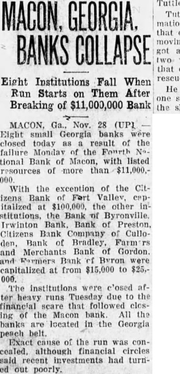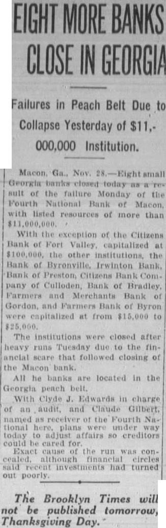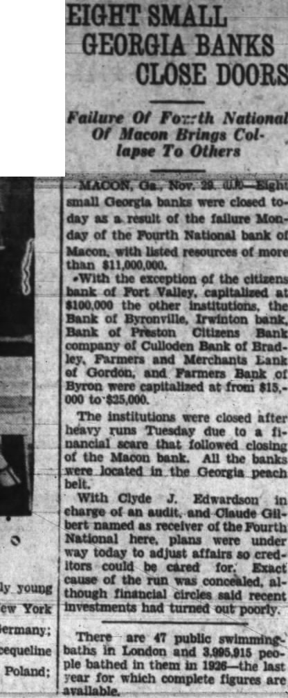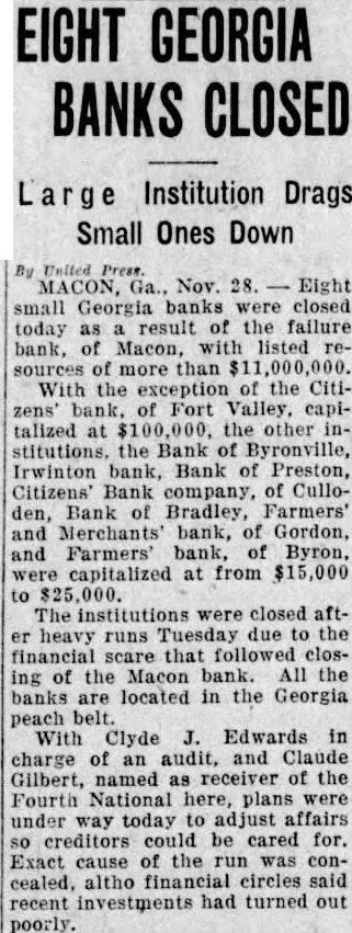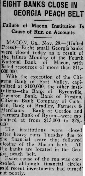 DANGER OF FALSE The failure of Middle Georgia open business following closing of the Fourth National Bank of Macon has caused widespread apprehension the part of depositors and just another of what will closing of the Fourth Namors do. tional necessary because of rumor. followed the bank found impossible to assets without shutting its doors. As soon this happened depositors all the surrounding section struck with sudden fear and their various banks closed for safety's Those which closed include the Bank Byromville, capitalized $15,000; Bank Bradley, capitalized $15,000; Bank Preston, capitalized at $15,000; Farmers Merchants Bank of Gordon, capitalized at Citizens Bank Fort Acthe Fort cording Valley the voted Monday. Mr. Martin ing the bank solvent and the was only The bank had the last financial the bank the profits All the other good condition closing and of the presidents declare that they will all re-open within short closings was tributed by the news the closing the Fourth Bank at Macon succession. National the approved agent for other banks and officials are certain the affairs the Macon readjusted all the banks will open good With work, the directors of the National are holding working out plans relieve situation for the the plans being has the ganization bank take over the Fourth National and start This new bank, should organized, would capital stock $750,000. has been shown that the whole affair was brought about through baseless rumor. Such rumors hard suppress once started for there rumor quite interesting positor alleged his bank. The closings reflection upon the financial situation Georgia people other the learn the closings small the will form to the reported state whole starts the original rumor. cases such rumors of some depositors might they about the banking their heads and work to prevent Times