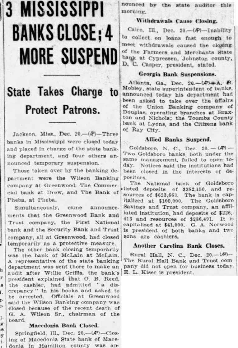 3 MISSISSIPPI BANKS CLOSE; 4 MORE SUSPEND State Takes Charge to Protect Patrons. Dec. Mississippi were today in of over by the the Commerand of at came that the Greenwood Bank and the National bank and the Security Bank and Trust all at Greenwood, closed protective The bank closing the bank of McLain at McLain A of the state banking department sent there to make an audit after Willie the bank's president that B. Reed, the cashier, admitted his asked to be said the was closed because of recent death of G. Wilson Sr., chairman of the board. Macedonia Bank Closed. ing of bank of Macedonia in Hamilton nounced by the state auditor this Withdrawals Cause Closing. Cairo, collect fast enough to caused the closing the Farmers and Merchants State bank at Cypressen, Johnston county, D. C. Casper, president, stated. Georgia Bank Suspensions. Mobley, state of announced today his department had been asked to take over the affairs the Union Banking company of branches at Braxand the Toombs at Lyons, and the Citizens bank of Ray City. Allied Banks Suspend. Dec. Two Goldsboro banks, both under the failed to open Notices said the institutions been closed in the interests of deNational bank of Goldsboro and sources of italized at The Goldsboro and Trust company, an had of $226, 413 and of at G. Norwood of both banks and sons cashiers. Another Carolina Bank Closes. Rural Hall, N. Dec. The Rural Hall Bank and Trust com pany did not open for business E. L. Kiser is president.