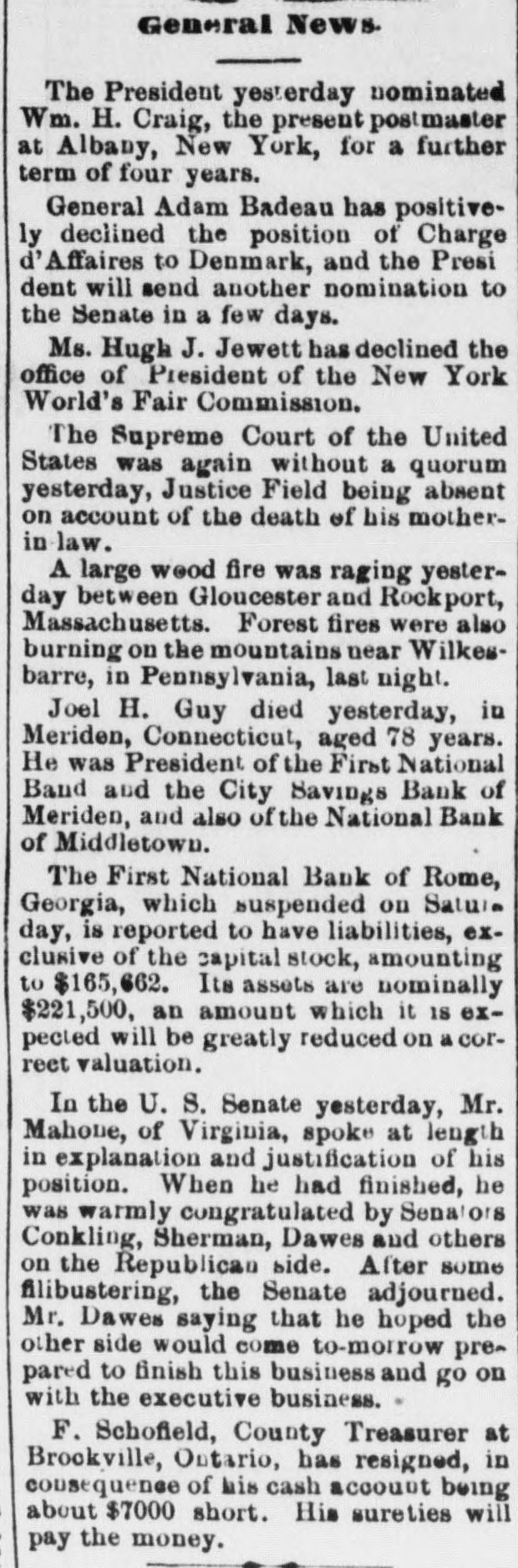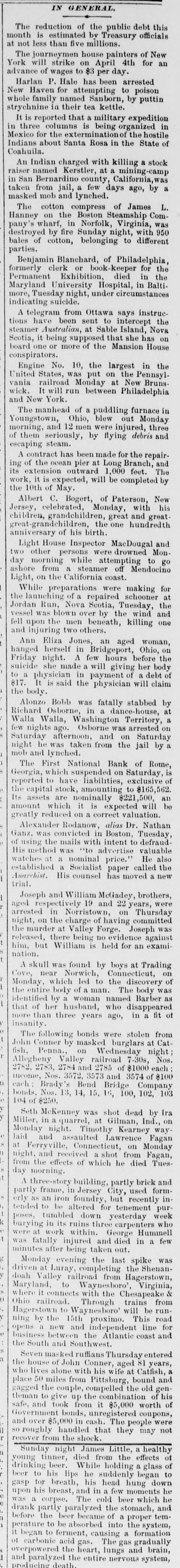 IN ENERAL. reduction of the public debt officials this The is estimated by Treasury month at not less than five millions journeymen house painters of for New an The will strike on April 4th advance York of wages to $3 per day. Harlan P. Hale has been arrested New Haven for attempting to by poison puttin whole family named Sanborn, strychnine in their tea kettle. reported that a military expedition in It is columns is being organized hostile in three the exterminatic of the State of Mexico Indians for about Santa Rosa in the Coahuila. Indian charged with killing a stock An named Kerstler, at a California,was mining-camp raiser Bernardino county, a in San from jail, a few days ago, by taken masked mob and lynched. cotton compress of James L. The on the Boston Steamship Com- was Hanney wharf, in Norfolk, Virginia, with 950 of bales cotton, pany's destroyed by fire Sunday belonging night, to different parties. Benjamin Blanchard, of Philadelphia, for the clerk or book- keeper in the formerly Exhibition, died BaltiPermanent University Hospital, in more, Maryland Tuesday night, under circumstances indicating suicide. A telegram from Ottawa says instruc- the have been sent to intercept tions Australian, at Sable Island, has Nova steamer being supposed that she House on Scotia, board one or it more of the Mansion conspirators. Engine No. 10, the largest the Pennsyl in the United States, was Monday put on at New Bruns and New York. wick. vania railroad It will run between Philadelphia manhead of puddling furnace Monday in The Ohio, blew out Youngstown, and 12 men were injured, three of morning, them seriously, by flying debris and escaping steam. contract has been made for the repair- and A ocean pier at Long Branch, The ing of the outward 1,000 feet. work, its extension expected, will be completed by the 10th of May Albert C. Bogert, of Paterson, with New his celebrated, Monday, children, Jersey, grandchildren, great one hundredth and greatgreat-grandchil dehildren, the anniversary of his birth. House Inspector MacDougal Mon and Light persons were drowned two day other morning while steamer attempting off Mendocino to go Light, ashore on from the California coast. While preparations were schooner making for at launching of a repaired the the Run, Nova Scotia, Tuesday, and Jordan blown over by the wind one vessel fell upon was the men beneath, killing and injuring two others. an Jones, aged woman, Ann Eliza herself in Bridgeport, Ohio, the on hanged night. A few hours before Friday made will giving her body suicide physician she in payment of debt claim of the body to a 817. It is said the physician will Alonzo Bobb was fatally stabbed by at Osborne, in dance-house, Osborne Walla Richard Walla, Washington was Territory arrested on few nights ago. Saturday afternoon, and on night Saturday he was taken from the jail by mob and lynched. First National Bank of Rome, is Georgia, The which suspended on Saturday, exclusive reported to stock, have amounting liabilities, to $165,562. capital nominally $221 500, an be which Its assets are it is expected will amount reduced on correct valuation. greatly Rodanow, alias Dr. Nathan Alexander convicted in Boston, Tuesday, Ganz, was the mails with intent to valuable defraudof using was 'to advertise also His method a nominal price. called He the watches at Socialist paper new established Anarchist. His counsel has moved a trial. Joseph and William McGadey, brothers, were respectivel 19 and 22 years, aged in Norristown on committed Thursday arrested on the charge of having night, at Valley Forge. Joseph was the murder there being no idence against exami released, him, but William is held for an nation. A skull was Norwich, found by Connecticut, boys at Trading on near which led to the discovery was of Monday, body of man. The Barber body the entire by woman named disappeared identified husband, who fit of that more of than her three years ago, in a from insanity. The following bonds were stolen at Catby masked burglars John Conner Penna. on Wednesday night Nos. fish, Valley railroad 7-30s, each Allegheny 2783, 2784 and 2785 of 81000 of $100 2782, 3572, 3573 and 3574 income, Nos. Bend Bridge Company 103 104 of $250. bonds, each Nos. Brady 13, 14, 15. 16, 100, 102, McKenney was shot dead by Ira on Seth quarrel at Gilman, Ind. Miller, in night. Timothy Kearney Fagan way Monday lited Lawrence laid and on Monday at Ferryvi ived Connecticut, shot from Fagan, day morning. from night, the and effects of which he died Tuesthree-story building, partly used brick form- and frame in Jersey City, partly foundry but recently inerly as an be iron altered for tenement purweek tended tumbled down yesterday who within. poses, burying in its ruins three George carpenters Hummell were fatally at work injured and died in a few was minutes after being taken out. Monday evening the last spike Shenan- was driven from at Luray, completing the gerstown, Valley railroad Virginia, doah Waynesboro' & Maryland, to Chesapeake with the from where it connects Through trains Ohio railroad will be runHagerstown to Waynesboro' This road ning by the 15th proximo. independent line for opens business a between new and the Atlantic coast and the South and Southwest. Seven masked ruffians Thursday entered years, house of John Conner, aged Catfish, 81 the lives alone with his wife at bound and the couple, place who 50 miles from compelled Pittsburg the old genof his tleman gagged to give up the combination worth of took from it 85,000 safe, and bonds, unregistered coupons, Government .000 in cash. The people were not and roughly over handled that they may recover from the shock. a healthy young Sunday tinner, night died While James from holding Little, the effects glass of of drinking his beer. lips he suddenly began down to beer to breath, his head hung he gasp his for breast and few moments which he upon The cold beer and drank was a partly corpse. paralyzed became the of stomach, proper tembefore the 
