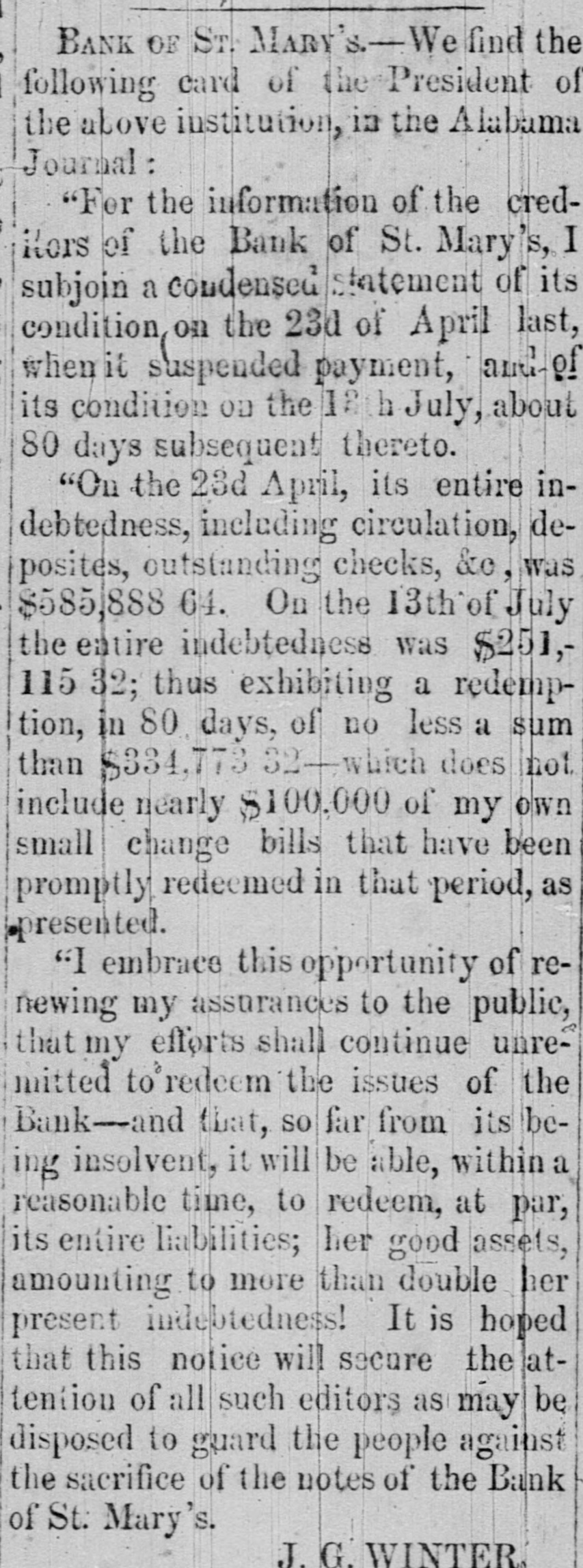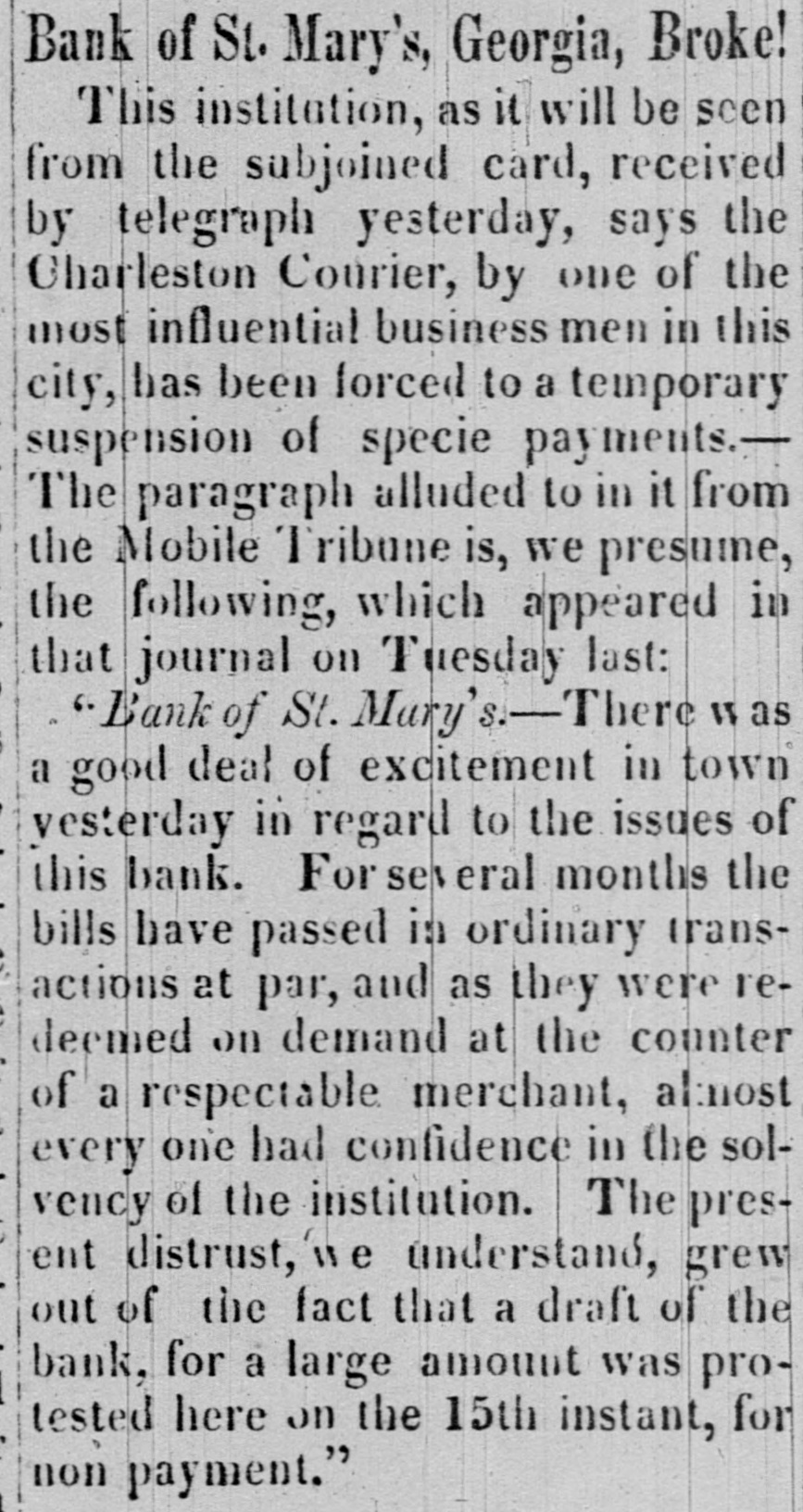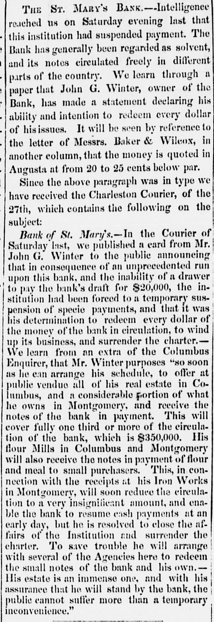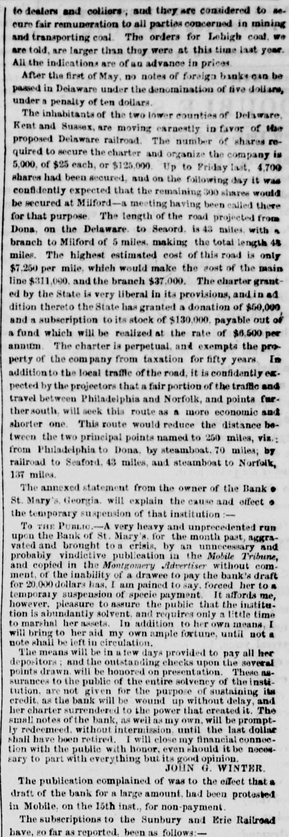 to dealers and colliers ; and they are considered to accure fair remuneration to all parties concerned in mining and transporting coal. The orders for Lehigh coal. we are told, are larger than they were at this time last year. All the indications are of an advance in prices After the first of May, no notes of foreign banks CAN be passed in Delaware under the denomination of five dollars, under a penalty of ten dollars. The inhabitants of the two lower counties of Delaware, Kent and Suasex, are moving earnestly in favor of the proposed Delaware railroad. The number of shares required to secure the charter and organize the company is 5,000, of $25 each, or $125,000. Up to Friday last, 4,700 shares had been secured, and on the following day it was confidently expected that the remaining 300 shares would be secured at Milford-- meeting having been called there for that purpose. The length of the road projected from Dona, on the Delaware. to Seaord. is 43 miles. with n branch to Milford of 5 miles. making the total length 48 miles. The highest estimated cost of this road is only $7,250 per mile, which would make the cost of the main line $311,000. and the branch $37.000. The charter granted by the State is very liberal in its provisions, and ad dition thereto the State has granted a donation of $50,000 and a subscription to its stock of $130,000. payable out of a fund which will be realized at the rate of $6,500 per annum The charter is perpetual. and exempts the property of the company from taxation for fifty years In addition the local traffic of the road, it is confidently ex. pected by the projectors that a fair portion of the traffic and travel between Philadelphia and Norfolk, and points fur. ther south, will seek this route as a more economic and shorter one. This route would reduce the distance between the two principal points named to 250 miles, viz.: from Philadelphia to Dona. by steamboat. 70 milea; by railroad to Seaford. 43 miles, and steamboat to Norfolk, 137 milea. The annexed statement from the owner of the Bank St. Mary's Georgia. will explain the cause and effect . the temporary suspension of that institution :To THE PUBLIC.-A very heavy and unprecedented run upon the Bank of St. Mary's for the month past, aggravated and brought to a crisis, by an unnecessary and probably vindictive publication in the Mobile Tribune, and copied in the Montgomery Advertiser without comment, of the inability of a drawee to pay the bank's draft for 20.000 dollars has, I am pained to say, forced her to n temporary suspension of specie payment. It affords me, however, pleasure to assure the public that the institution is abundantly solvent. and requires only a little time to marshal her assets. In addition to her own means, I will bring to her aid my own ample fortune, until not a note shall be left in circulation. The means will be in a few days provided to pay all her depositors; and the outstanding checks upon the several points drawn will be honored on presentation. These assurances to the public of the entire solvency of the institution. are not given for the purpose of sustaining its credit. as the bank will be wound up without delay, and her charter surrendered to the power that created it. The small notes of the bank, as weil as my own, will be promptly redeemeed. without intermission. until the last dollar shall have been retired. I will close my financial connection with the public with honor, even should it be neces. sary to part with everything but its good opinion. JOHN G. WINTER. The publication complained of was to the effect that a draft of the bank for a large amount. had been protested in Mobile. on the 15th inst., for non-payment. The subscriptions to the Sunbury and Erie Railroad have, 80 far as reported. been as follows:-