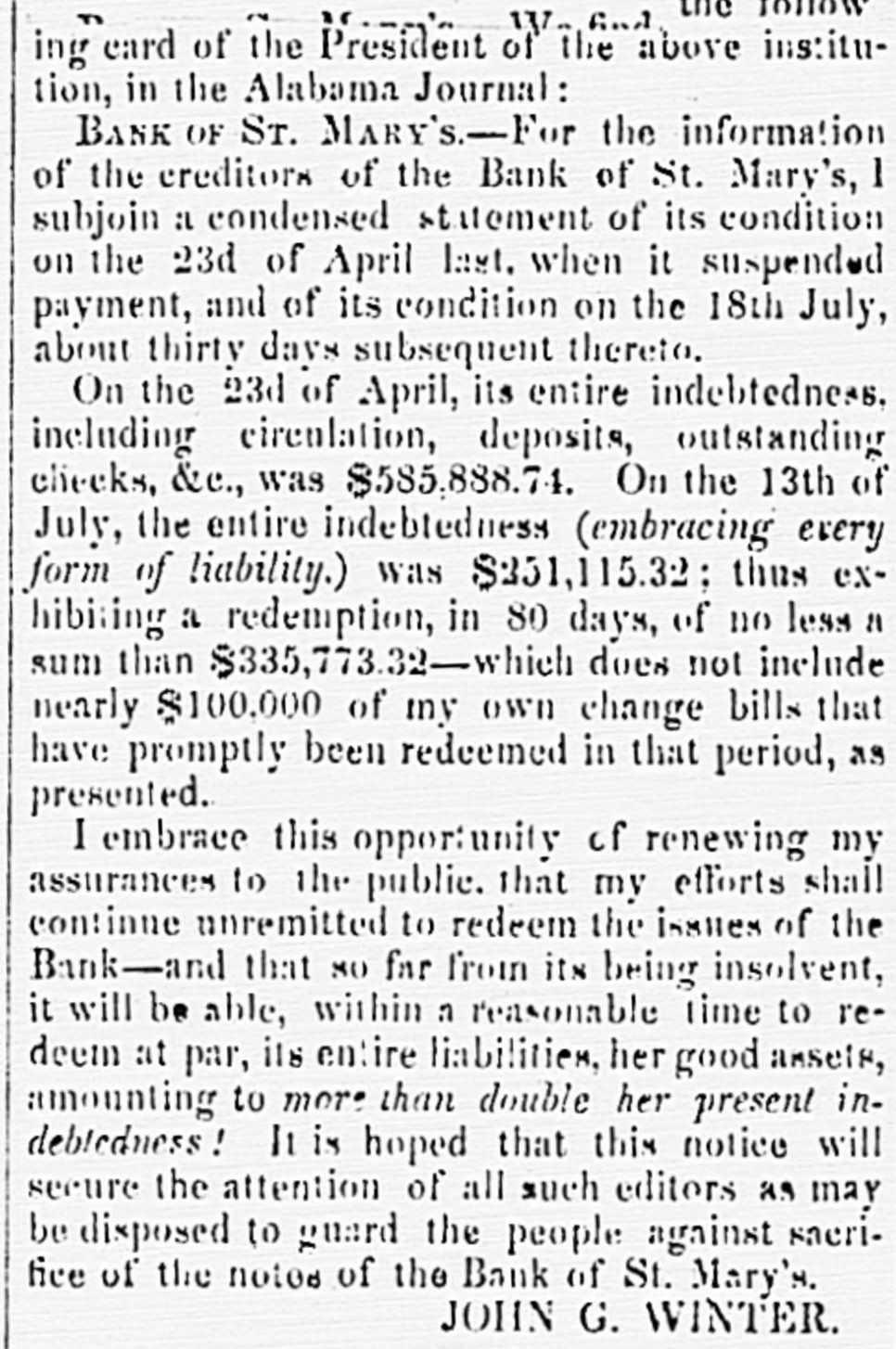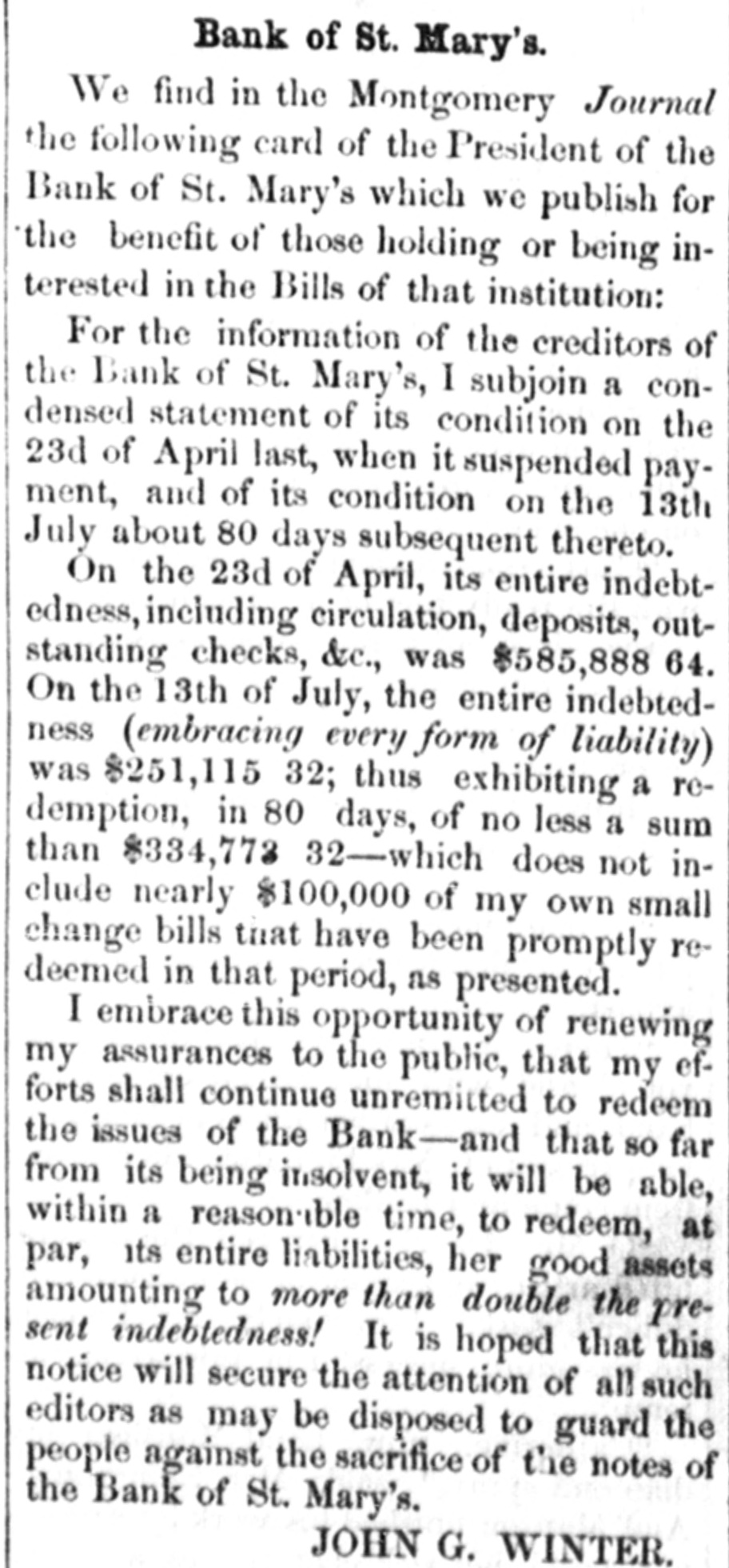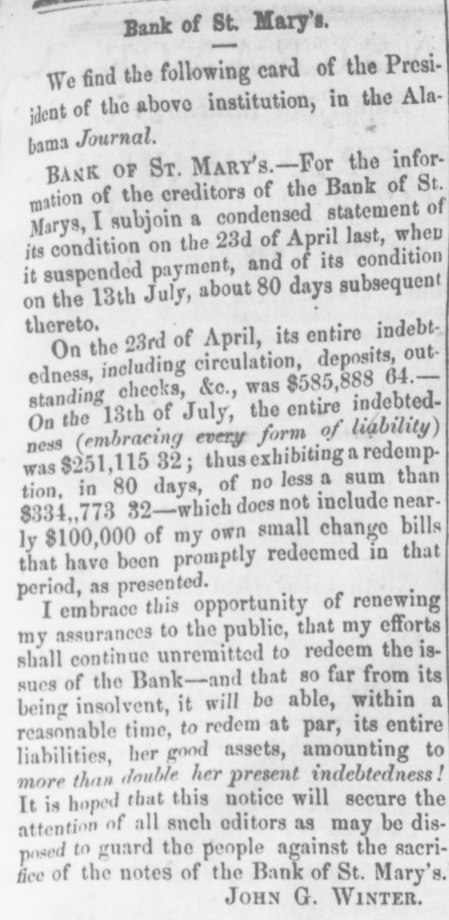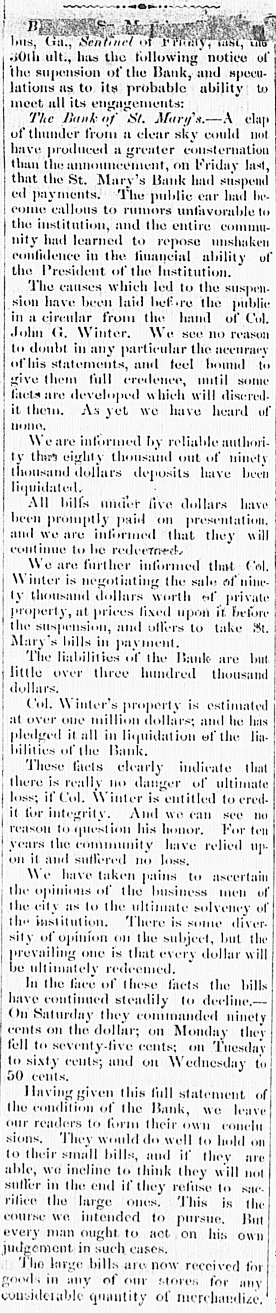 to dealers and colliers ; and they are considered to accure fair remuneration to all parties concerned in mining and transporting coal. The orders for Lehigh coal. we are told, are larger than they were at this time last year. All the indications are of an advance in prices After the first of May, no notes of foreign banks CAN be passed in Delaware under the denomination of five dollars, under a penalty of ten dollars. The inhabitants of the two lower counties of Delaware, Kent and Suasex, are moving earnestly in favor of the proposed Delaware railroad. The number of shares required to secure the charter and organize the company is 5,000, of $25 each, or $125,000. Up to Friday last, 4,700 shares had been secured, and on the following day it was confidently expected that the remaining 300 shares would be secured at Milford-- meeting having been called there for that purpose. The length of the road projected from Dona, on the Delaware. to Seaord. is 43 miles. with n branch to Milford of 5 miles. making the total length 48 miles. The highest estimated cost of this road is only $7,250 per mile, which would make the cost of the main line $311,000. and the branch $37.000. The charter granted by the State is very liberal in its provisions, and ad dition thereto the State has granted a donation of $50,000 and a subscription to its stock of $130,000. payable out of a fund which will be realized at the rate of $6,500 per annum The charter is perpetual. and exempts the property of the company from taxation for fifty years In addition the local traffic of the road, it is confidently ex. pected by the projectors that a fair portion of the traffic and travel between Philadelphia and Norfolk, and points fur. ther south, will seek this route as a more economic and shorter one. This route would reduce the distance between the two principal points named to 250 miles, viz.: from Philadelphia to Dona. by steamboat. 70 milea; by railroad to Seaford. 43 miles, and steamboat to Norfolk, 137 milea. The annexed statement from the owner of the Bank St. Mary's Georgia. will explain the cause and effect . the temporary suspension of that institution :To THE PUBLIC.-A very heavy and unprecedented run upon the Bank of St. Mary's for the month past, aggravated and brought to a crisis, by an unnecessary and probably vindictive publication in the Mobile Tribune, and copied in the Montgomery Advertiser without comment, of the inability of a drawee to pay the bank's draft for 20.000 dollars has, I am pained to say, forced her to n temporary suspension of specie payment. It affords me, however, pleasure to assure the public that the institution is abundantly solvent. and requires only a little time to marshal her assets. In addition to her own means, I will bring to her aid my own ample fortune, until not a note shall be left in circulation. The means will be in a few days provided to pay all her depositors; and the outstanding checks upon the several points drawn will be honored on presentation. These assurances to the public of the entire solvency of the institution. are not given for the purpose of sustaining its credit. as the bank will be wound up without delay, and her charter surrendered to the power that created it. The small notes of the bank, as weil as my own, will be promptly redeemeed. without intermission. until the last dollar shall have been retired. I will close my financial connection with the public with honor, even should it be neces. sary to part with everything but its good opinion. JOHN G. WINTER. The publication complained of was to the effect that a draft of the bank for a large amount. had been protested in Mobile. on the 15th inst., for non-payment. The subscriptions to the Sunbury and Erie Railroad have, 80 far as reported. been as follows:-