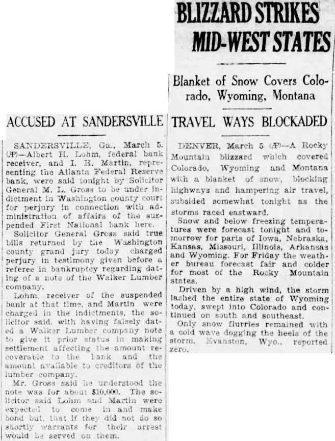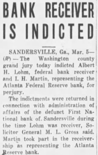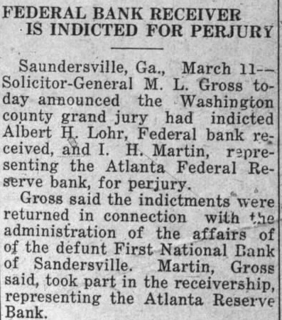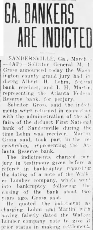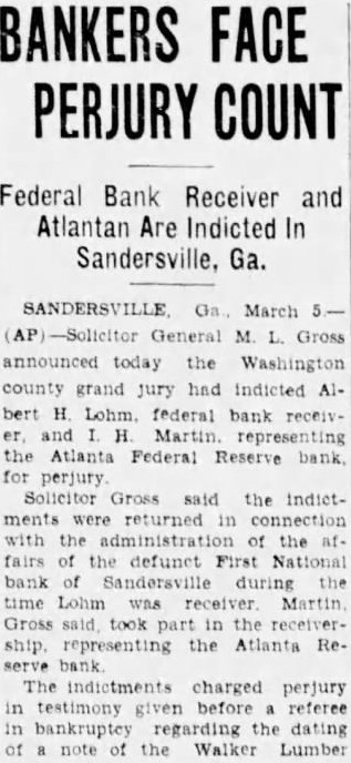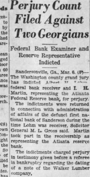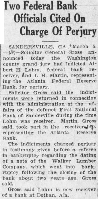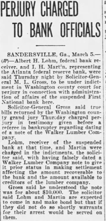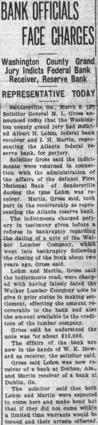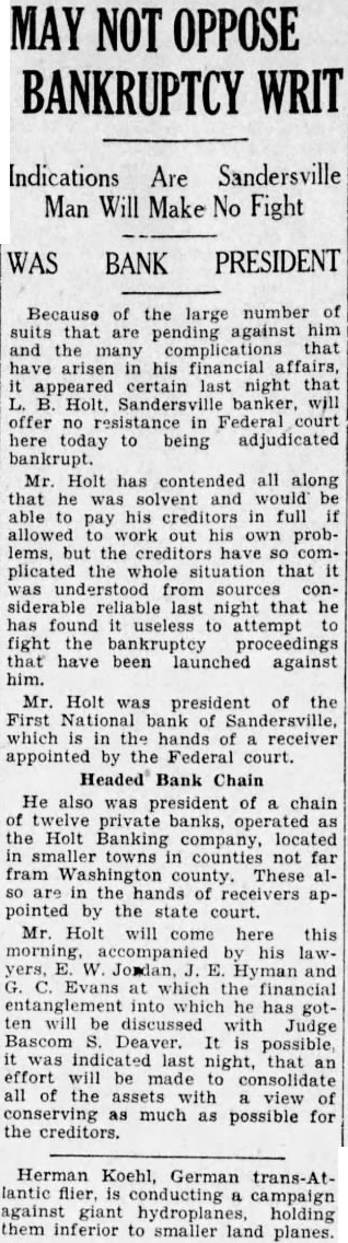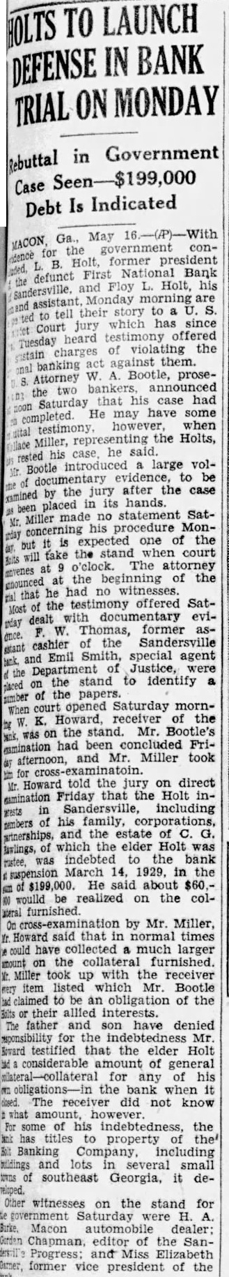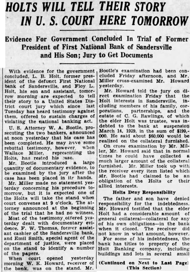 Outstanding Notes. The general trend of Mr. Smith's has been show how Holts have manipulated cash funds of the bank by discounting the alleged worthless notes, all of which. the evidence were outstanding and the suspension of the bank. Many the were dated back 1927, Figuring in the testimony of Mr. Smith today was the Auto Trading Company. Augusta, one of the terests May. former vice president of the Sandersville bank. May is under in with the failure but not now on Mr. Smith showed by the records the bank that Trading Company $10,000 was counted by institution vember 26, The Holt Banking received $5,000 credit. and by the following Decemthe amount had been withdrawn. The other $5,000, was shown, took up prior note of the trading The collateral on the note. Mr. Smith was bill of sale to the stock and equipment of the Augusta to less than in The showed that the original note was not available because and renewals from time to time. Mr. Smith pointed out. how ever. that with credit of $1,830. the outstanding the bank's suspension in March, 1929. the time of that transaction. Mr. Smith said, the May Company by Mr. Bootle dummy partner$8,350 bank. the $10,000 Mr. Bootle charged that May in debtedness to the bank had exceeded the $10,000 limit of an individual. and brought about false report to the the elder Holt charged with refalsely the comptroller as his own responsibility the bank. Mr. Smith, testifying from the records of the said that call 1928 Holt indebted the bank in Several other transactions were brought out in detail.