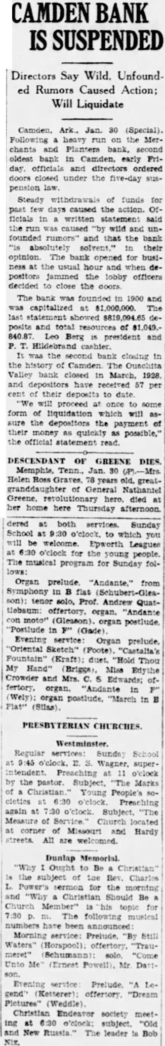 CAMDEN BANK IS SUSPENDED Directors Say Wild. Unfounded Rumors Caused Action; Will Liquidate Camden, Ark., Jan. 30 (Special). Following heavy run on the Merchants and Planters bank, second oldest bank in Camden, early Friday, officials and directors ordered doors closed under the five-day suspension Steady withdrawals of funds for past few days caused the action. Officials in written statement said the run was caused "by wild and unfounded rumors" and that the bank "is absolutely solvent." in their opinion. The bank opened for business the usual hour and when depositors jammed the lobby officers decided to close the The bank was founded in 1900 and was capitalized at $1,000,000. The last statement $819,094.65 deposits and total of $1,049.840.87 Leo Berg president and cashier. It was the second bank closing in the history of Camden. The Ouachita Valley bank closed in March, 1928. and depositors have received 57 per cent of their deposits to date will proceed at once to some form of liquidation which will assure the depositors the payment of their money as quickly as possible," the official statement read. DESCENDANT OF GREENE DIES. Memphis, Tenn., Jan. 30 Helen Ross Graves, 78 years old. greatof General Nathaniel Greene, hero, died at her home here Thursday afternoon. dered at both services. Sunday School at 9:30 o'clock, to which you will be welcome. Epworth Leagues at 6:30 o'clock for the young people. The musical program for Sunday follows: Organ prelude "Andante," from Symphony in B flat (Schubert-Gleason); tenor solo, Prof. Andrew Quatcon (Gleason). organ postlude, "Postlude in F" (Gade). Evening service: Organ prelude, "Oriental Sketch" (Foote). "Castalia's Fountain" (Kraft): duet. "Hold Thou My Hand" (Brigge), Miss Edythe Crowder Mrs. Edwards; offertory, organ, "Andante in F" (Wely): organ postlude, "March in Flat" (Silas). PRESBYTERIAN CHURCHES. Westminster. Regular services: Sunday School at o'clock, Wagner, superintendent. Preaching o'clock by the pastor. Subject, "The Marks of Christian. Young People's cleties 6:30 o'clock. Preaching again at 7:30 o'clock. Subject. "The Measure of Service Church located at corner of Missouri and Hardy streets. All are welcomed. Dunlap Memorial. "Why Ought to Be Christian" the subject of the Rev. Charles Power's sermon for the morning and "Why Christian Should Be Church Member" topic for 7:30 The following musical numbers been announced: Morning service: Prelude. "By Still Waters" (Horspool): offertory, "Traumeret" solo. "Come Unto Me" (Ernest Powell), Mr. Dattson. Evening "A Pictures" (Weddle). Christian Endeavor society meeting at 6:30 e'clock: subject, "Old and New The leader Bob