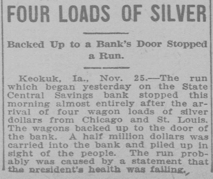 RUN ON SAVINGS BANK STOPPED BY STRATEGY. Keokuk, Iowa, Nov. 25.-A run which began yesterday on the State Central Savings bank was stopped this morning almost entirely, after the arrival of four wagon loads of silver dollars from Chicago and St. Louis. The wagons backed up to the door of the bank an dhalf a million dollars were carried into the bank and piled up in sight of the people.