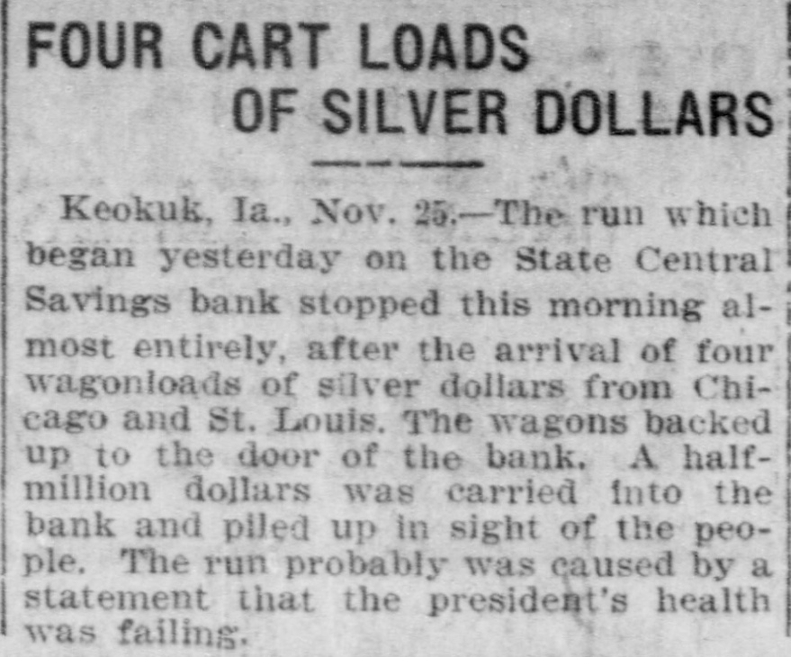 Multiple contemporary reports (Nov 24โ25, 1905) describe a run on the savings department of the State Central Savings Bank in Keokuk that was quelled by bringing large quantities of silver dollars to the bank and displaying them. Reports attribute the panic to statements that the president's health was failing (rumor). No suspension, receivership, or permanent closure is mentioned.