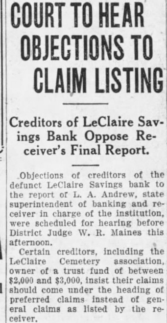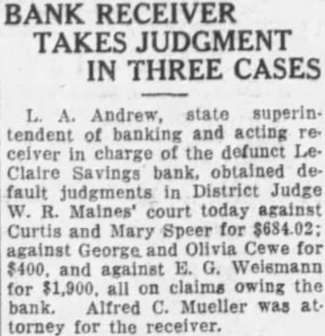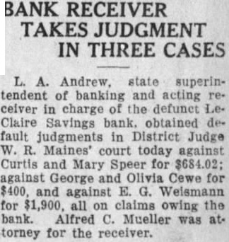 66 Stockholders in Defunct LeClaire Savings Bank Sued For $25,000 to Cover Deficit individuals and and controlling 250 shares of the capital stock of the LeClaire Savings bank, which suspended business on Oct. 13, were named defendants in suit to collect 100 per stock assessment the deficiency, filed district court today by Andrew state superin tendent of banking. thru his special attorney Alfred Mueller the naming the signed by Judge W Scott granting the W state superto bring from upon num held by the individ and Claims of depositors, exclusive of bills payable pending against the total accordin Mr. Andrew The existing collecall exclusive of the assessment, the stated names of and the numbers respective shares court asked levy assessment John Auliff LeClaire share: Balley Davenport, Banta, DeWitt Boege, shares Henry Boeh, Barnes, share Claude Brown, Brown, George Bucks, Carroll, shares Frank CaverGeorge Olivia 19 shares Clark, Claire, shares. Danson, Princeton,