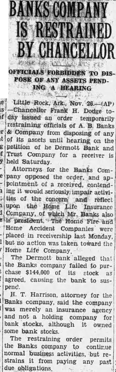 BANKS COMPANY IS RESTRAINED BY CHANCELLOR OFFICIALS FORBIDDEN TO DISPOSE OF ANY ASSETS PENDING A HEARING Little Rock, Ark., Nov. 26.-(AP) Chancellor Frank H. Dodge today issued an order temporarily restraining officials of A. B. Banks & Company from disposing of any of its assets until hearing on the petition of he Dermott Bank and Trust Company for a receiver is held Saturday Attorneys for the Banks Company opposed the order, and appointment of a received, contending it would seriously impair activities of the concern and reflect upon the Home Life Insurance Company, of which Mr. Banks also is president. The Home Fire and Home Accident Companies were placed in receivership last Monday, but no action was taken toward the Home Life Company The Dermott bank alleged that the Banks company failed to purchase $144,000 of its stock as agreed, causing the bank to suspend. H. T. Harrison, attorney for the Banks company, said the company was merely an insurance agency and not a holding company for bank stocks, although it owned some bank stocks. The restraining order permits the Banks company to continue normal business activities, but restrains it from paying any past due obligations.