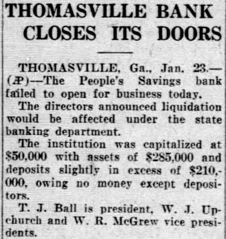 THOMASVILLE BANK CLOSES ITS DOORS Jan. People's Savings bank failed to open for business today. The would affected under the state banking department. The institution capitalized $50,000 with assets $285,000 deposits slightly excess of $210,000, owing no money except deposiBall president. church and McGrew vice presidents.