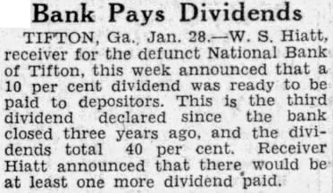 Bank Pays Dividends TIFTON, Ga. Jan. S. Hiatt, receiver for the defunct National Bank of Tifton, this week announced that 10 per cent dividend was ready to be to depositors. This is the third paid dividend declared since the closed three years and the dividends total 40 per cent. Receiver that there would be at least one more dividend paid.