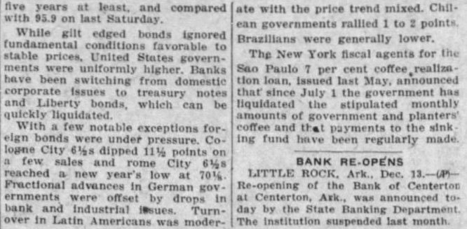five years at least, and compared with 95.9 on last Saturday. While gilt edged bonds ignored fundamental conditions favorable to stable prices, United States governments were uniformly higher. Banks have been switching from domestic corporate Issues to treasury notes and Liberty bonds, which can be quickly liquidated. With few notable exceptions foreign bonds were under pressure. Cologne City 6½ dipped 11½ points on few sales and rome City 6½8 reached a new year's low at 70% Fractional advances in German gov ernments were offset by drops in over in Latin Americans was moder- ate with the price trend mixed. Chilean governments rallied 1 to : points Brazilians were generally lower. The New York fiscal agents for the Sao Paulo 7 per cent coffee realiza tion loan, issued last May, announced that since July the government has liquidated the stipulated monthly amounts of government and planters' coffee and that payments to the sink ing fund have been regularly made