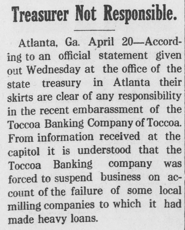 Treasurer Not Responsible. Atlanta, Ga. April 20-According to an official statement given out Wednesday at the office of the state treasury in Atlanta their skirts are clear of any responsibility in the recent embarassment of the Toccoa Banking Company of Toccoa. From information received at the capitol it is understood that the Toccoa Banking company was forced to suspend business on account of the failure of some local milling companies to which it had made heavy loans.
