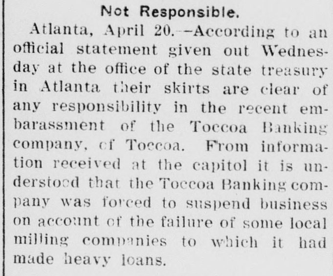 Not Responsible. Atlanta, April 20.-According to an official statement given out Wednesday at the office of the state treasury in Atlanta their skirts are clear of any responsibility in the recent embarassment of the Toccoa Banking company, of Toccoa. From information received at the capitol it is understood that the Toccoa Banking company was forced to suspend business on account of the failure of some local milling companies to which it had made heavy loans.