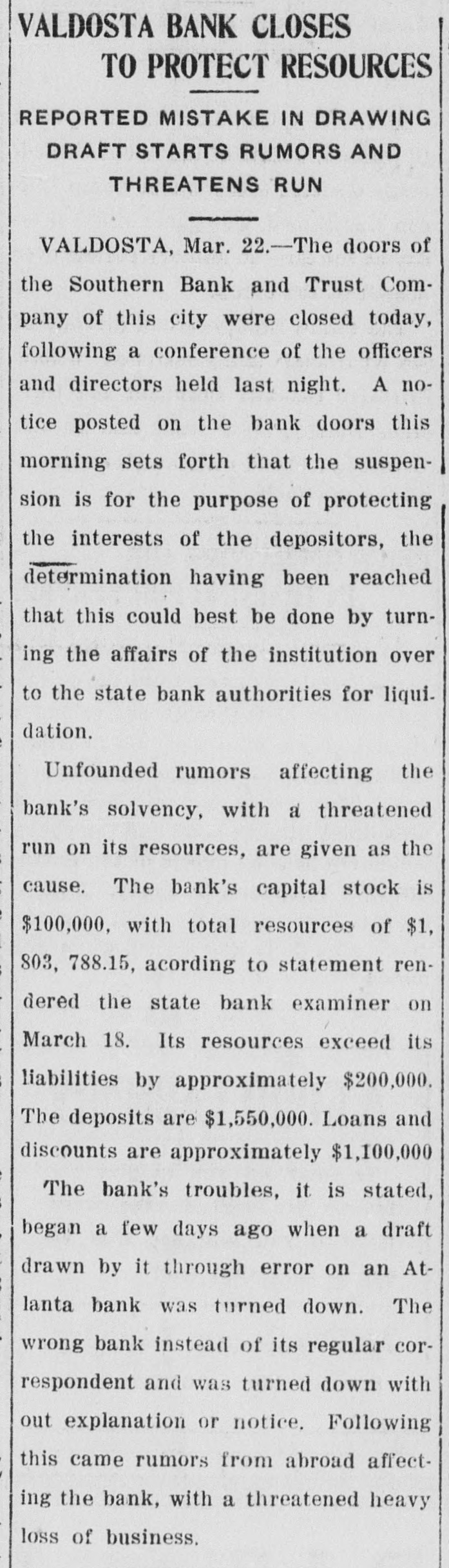 VALDOSTA BANK CLOSES TO PROTECT RESOURCES REPORTED MISTAKE IN DRAWING DRAFT STARTS RUMORS AND THREATENS RUN VALDOSTA, Mar. 22.-The doors of the Southern Bank and Trust Company of this city were closed today, following a conference of the officers and directors held last night. A notice posted on the bank doors this morning sets forth that the suspension is for the purpose of protecting the interests of the depositors, the determination having been reached that this could best be done by turning the affairs of the institution over to the state bank authorities for liquidation. Unfounded rumors affecting the bank's solvency, with a threatened run on its resources, are given as the cause. The bank's capital stock is $100,000, with total resources of $1, 803, 788.15, acording to statement rendered the state bank examiner on March 18. Its resources exceed its liabilities by approximately $200,000. The deposits are $1,550,000. Loans and discounts are approximately $1,100,000 The bank's troubles, it is stated, began a few days ago when a draft drawn by it through error on an Atlanta bank was turned down. The wrong bank instead of its regular correspondent and was turned down with out explanation or notice. Following this came rumors from abroad affecting the bank, with a threatened heavy loss of business.